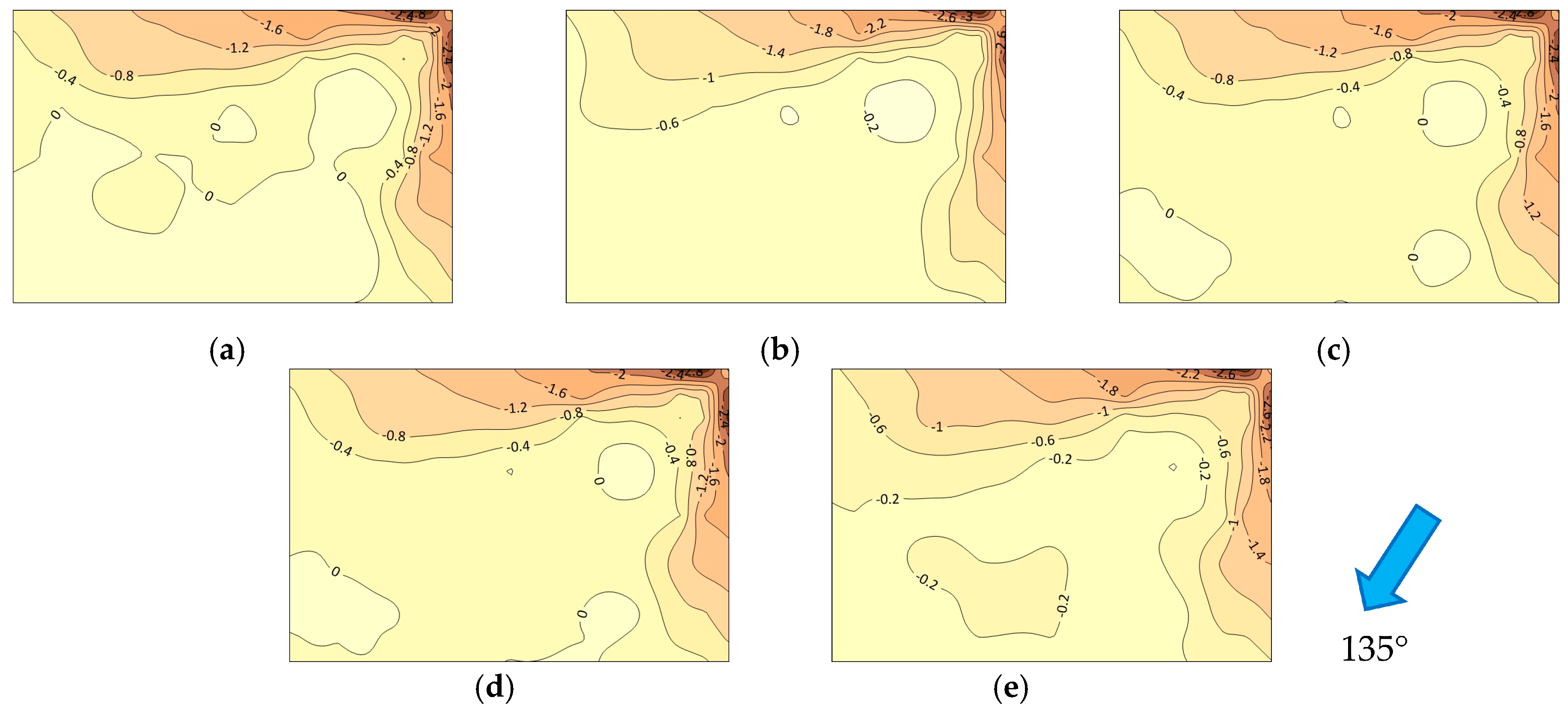 Figure 9. Distribution of mean wind pressure coefficients of various parapets at 135° wind angle: (a) no parapet Ref; (b) solid parapet M1; (c) horizontal parapet M2; (d) vertical parapet M3; (e) rectangular grid parapet M4 (the closer the color is to brown, the larger the magnitude of the negative wind pressure coefficient).