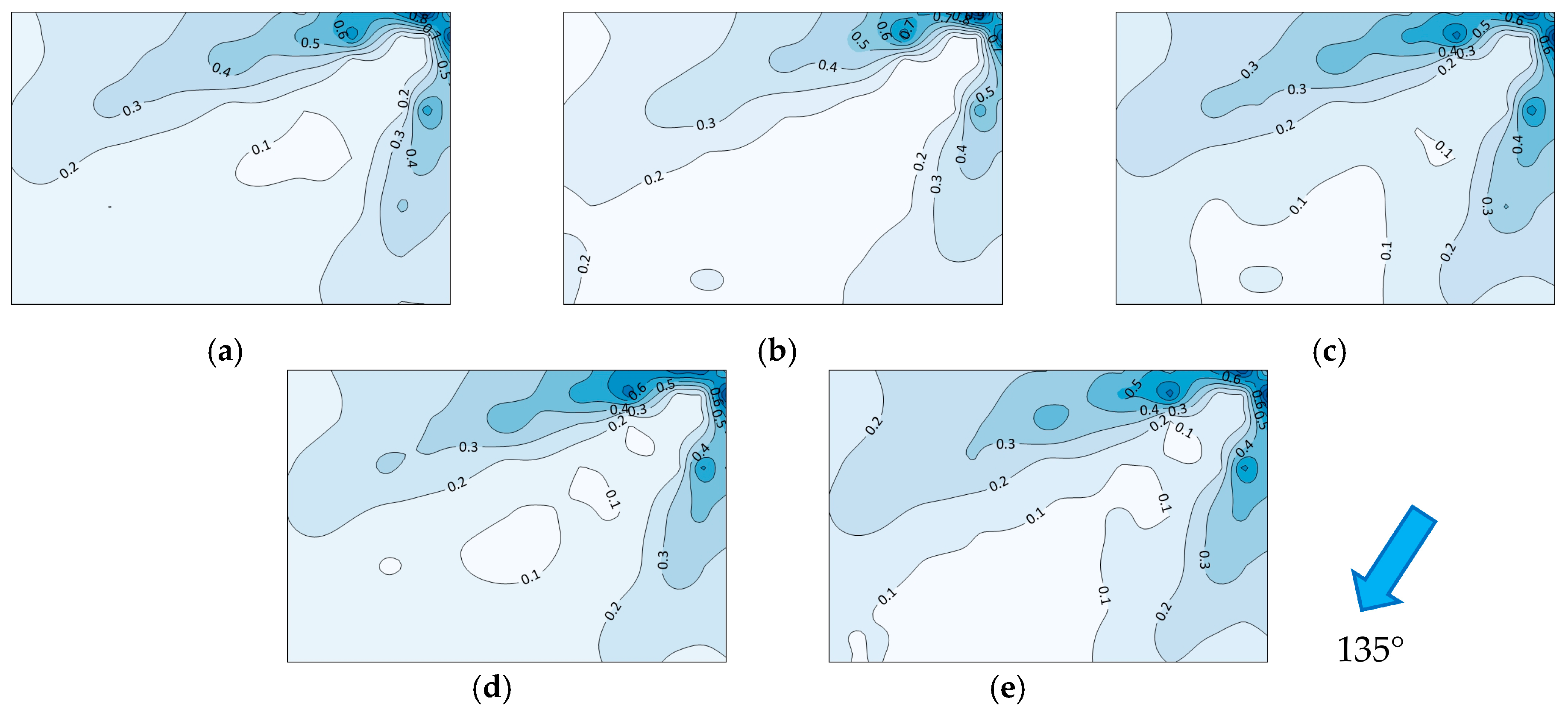 Figure 10 provides the distribution pattern of the net fluctuating wind pressure on the overhead photovoltaic roof on the rooftop of the bottom building under different parapet configurations with the wind approaching at 135°. As shown in Figure 10, compared with the case without a parapet (Ref), the presence of parapets reduces the fluctuating wind pressure coefficients to some extent in the windward leading-edge corner region. The maximum fluctuating wind pressure coefficients for models M1 to M4 are 1.08, 1.02, 0.96, and 0.98, respectively, which decrease by 7%, 12%, 17%, and 16% compared with the value of 1.16 for Ref. This behavior is significantly different from that under the 45° incoming wind direction, indicating that the windward inclination angle and the vertical clearance at the windward eave modify the way parapets alter the fluctuating wind pressure.