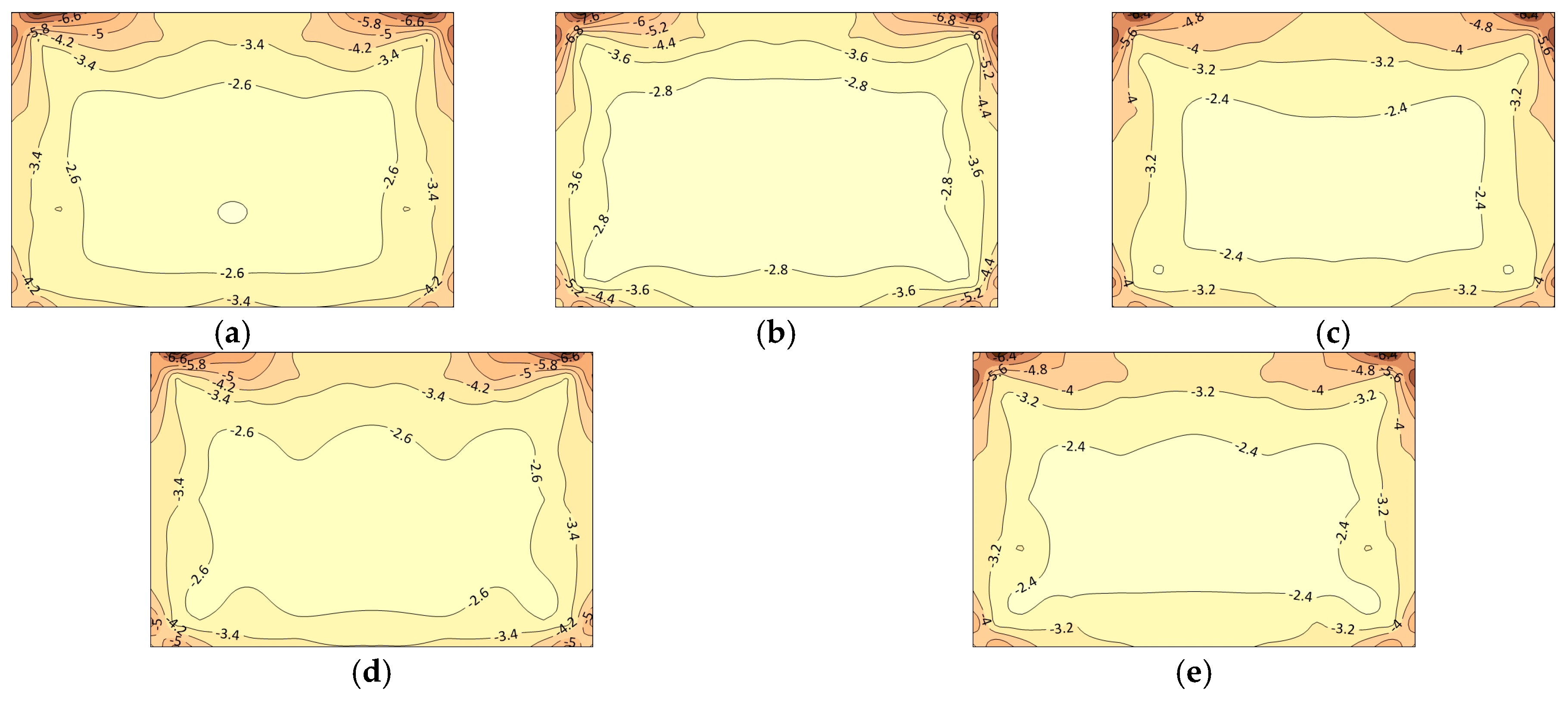 Figure 13. Most unfavorable minimum pressure coefficient under all wind directions: (a) without a parapet Ref; (b) solid parapet M1; (c) horizontal parapet M2; (d) vertical parapet M3; (e) rectangular grid parapet M4 (the closer the color is to brown, the larger the magnitude of the negative wind pressure coefficient).