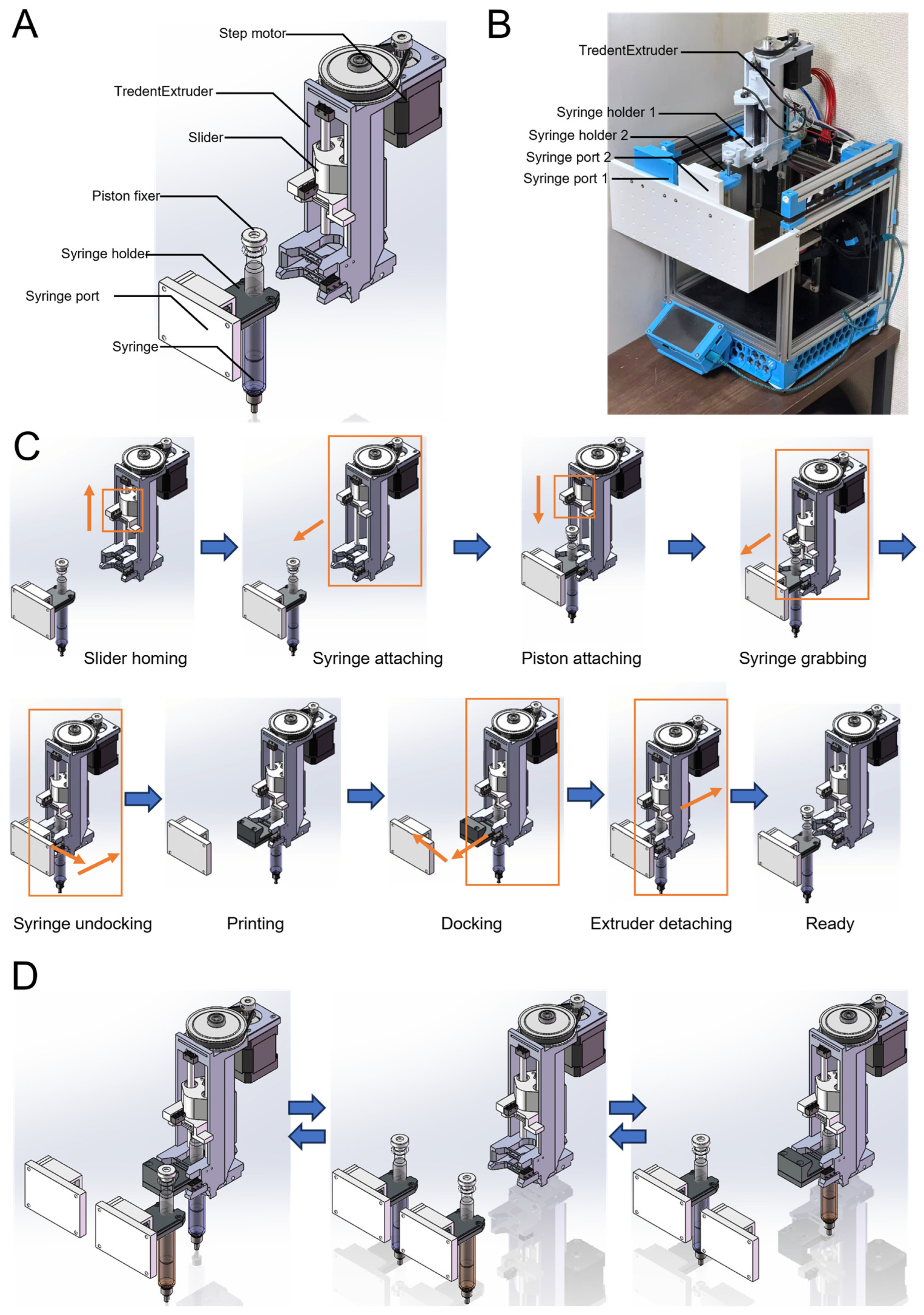To facilitate incremental upgrading and improve cross-platform compatibility, the TridentExtruder was intentionally designed to retain key strengths of the Replistruder 4. The syringe holder preserves the same dimensions and is therefore fully compatible across the two systems. The assembly process is also largely unchanged, allowing users familiar with the Replistruder 4 to adopt the TridentExtruder with minimal additional effort. The two systems can directly share the syringe holders, and the TridentExtruder can grip the Replistruder 4 syringe holder without screws, enabling rapid manual attachment and detachment.