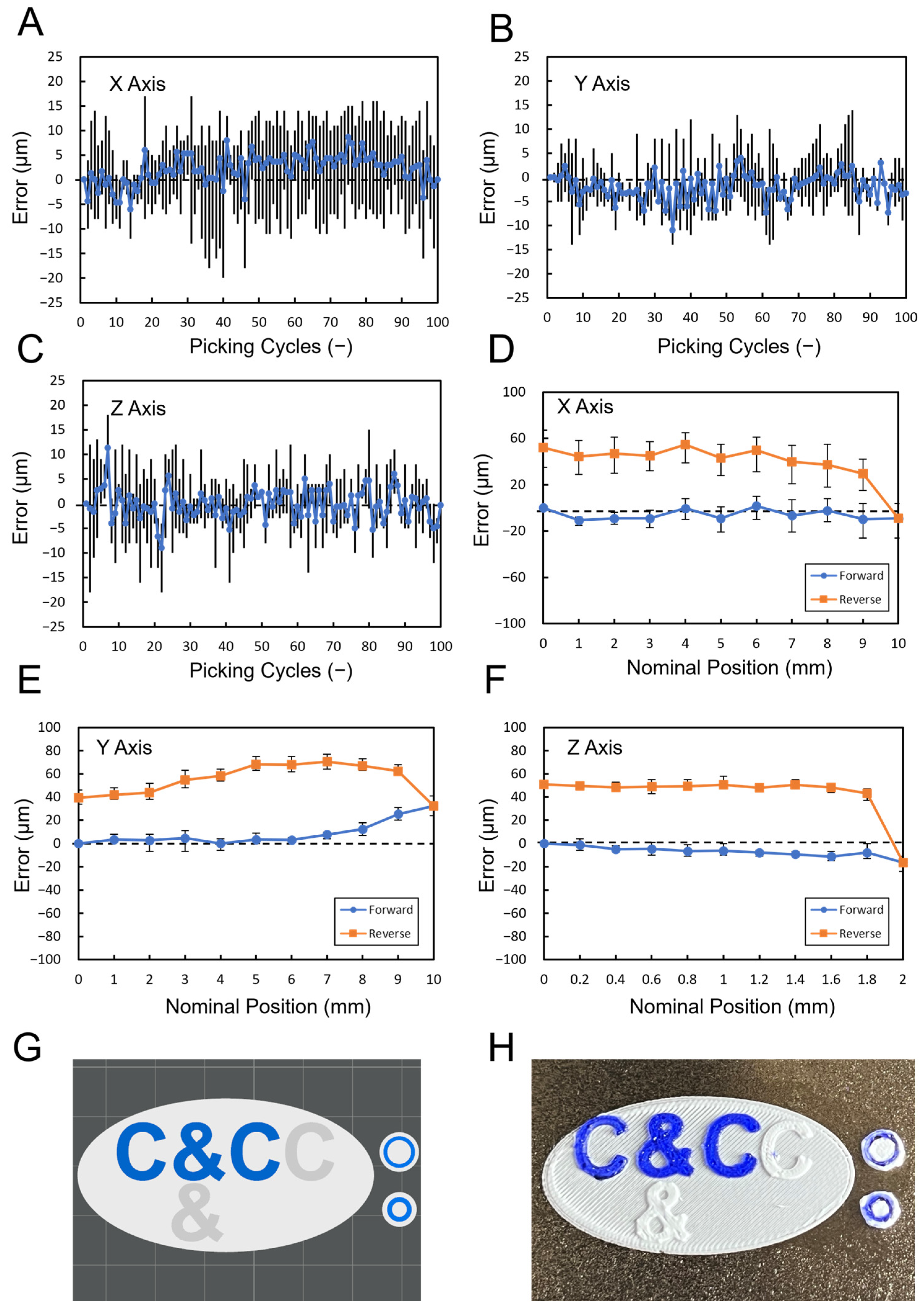 Syringe pickup repeatability was assessed by first picking up the syringe and moving the printhead to a predefined measurement position, where the indicator was zeroed. The syringe was then returned, picked up again, and brought back to the same coordinates for measurement. This cycle was repeated 100 times, and the entire procedure was repeated three times after system restart.