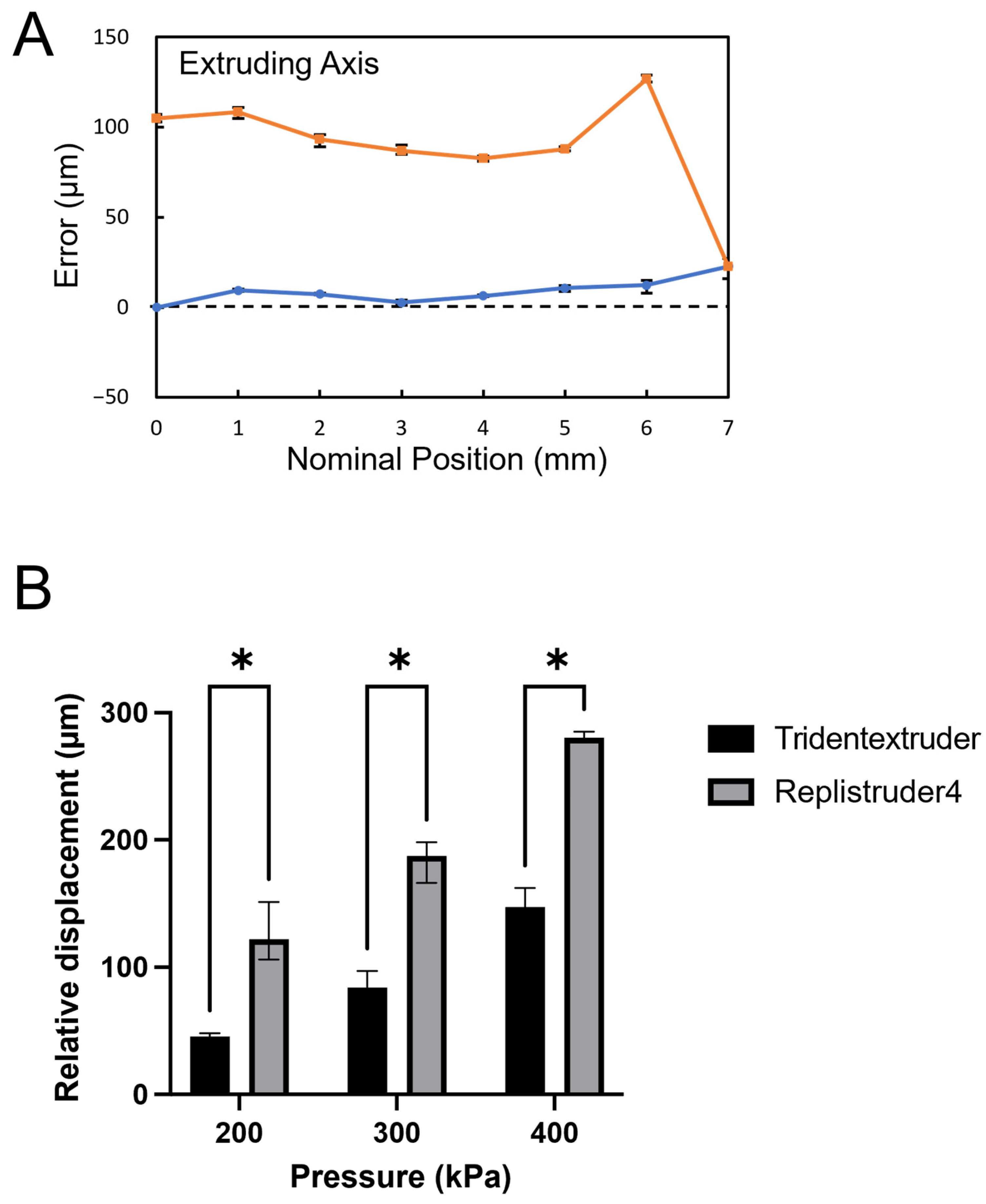Performance testing further showed that the TridentExtruder had a unidirectional error below 27 µm over a 7 mm travel distance, indicating adequate precision for controlled extrusion. In pressure tests, the TridentExtruder also outperformed the widely used Replistruder 4 [
