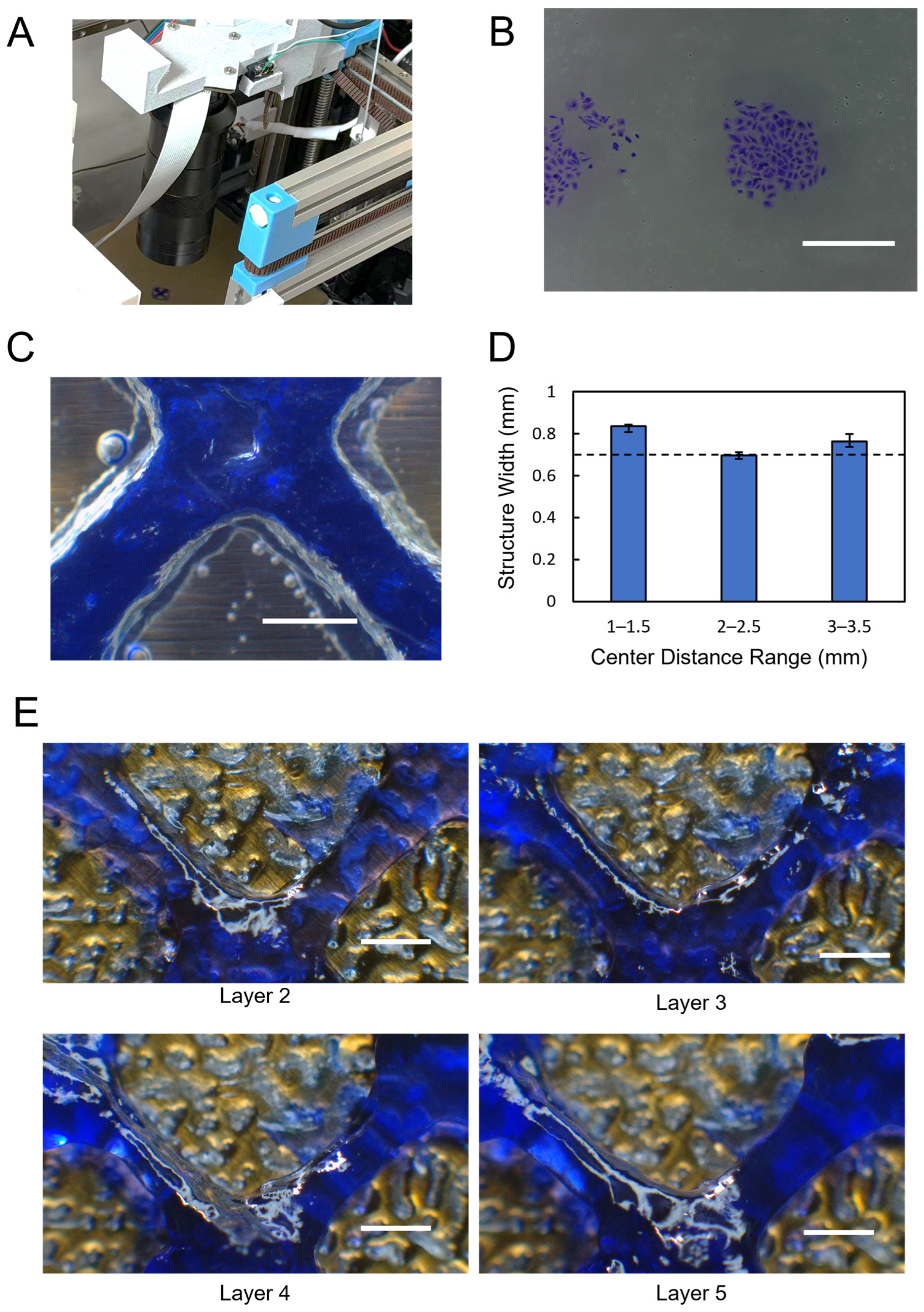 Printed constructs were imaged with the microscope module at 1.8× magnification. A stage micrometer was imaged under identical conditions for calibration. The pixel length corresponding to 1 mm on the stage micrometer was determined in ImageJ 1.54p, and the pixel thickness of the thin-wall features in the printed construct was measured using the same software. These measurements were then used to calculate the actual thickness of the thin-wall features.