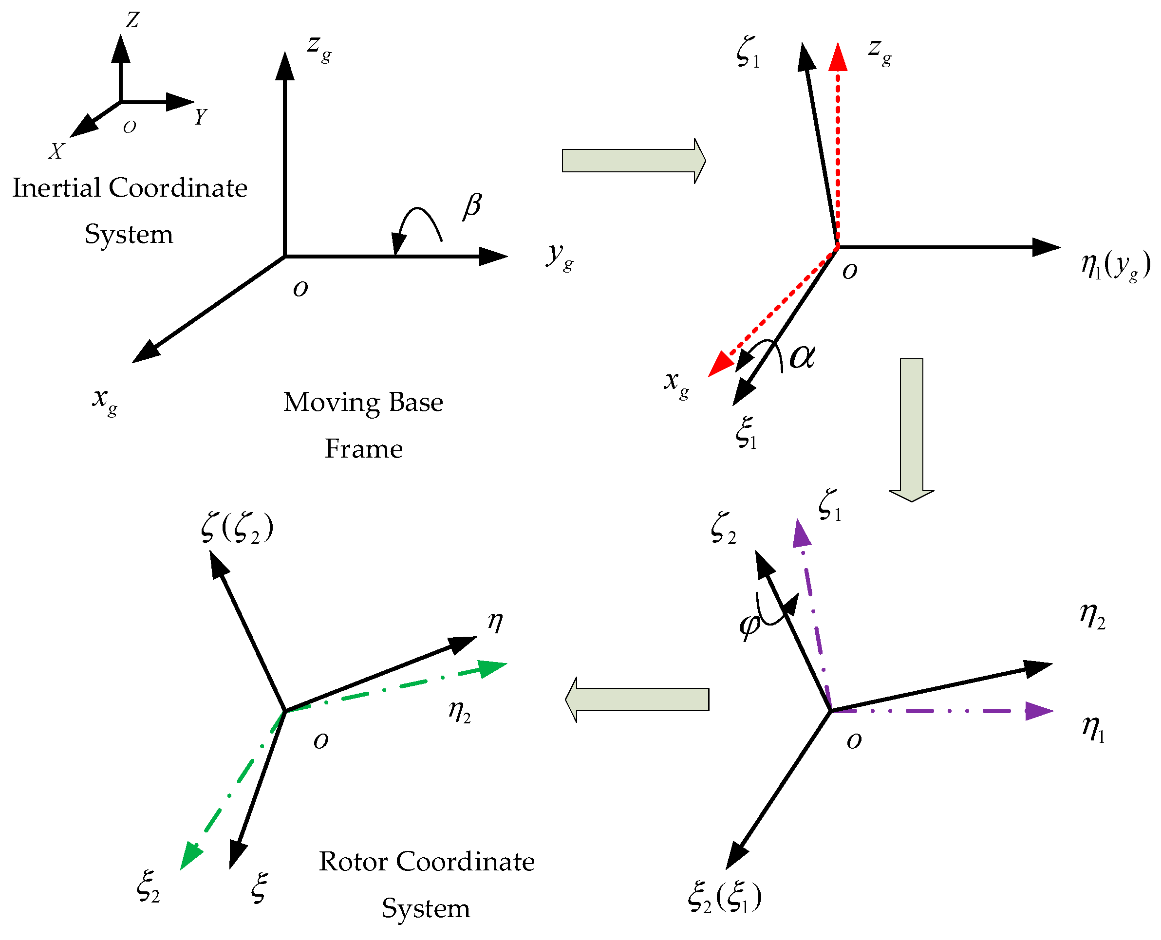 - Rotor Coordinate System: , fixed to the rotor; rotates with the rotor about its center of mass and aligns with the rotor’s principal axes of inertia. In the initial state, their origins coincide. The transformation from the moving base frame to the rotor frame is illustrated in Figure 2: First, a rotation by angle about the yg axis yields the frame. Next, a rotation by angle about the intermediate axis gives the frame. Finally, a rotation by angle about the axis results in the rotor coordinate system .