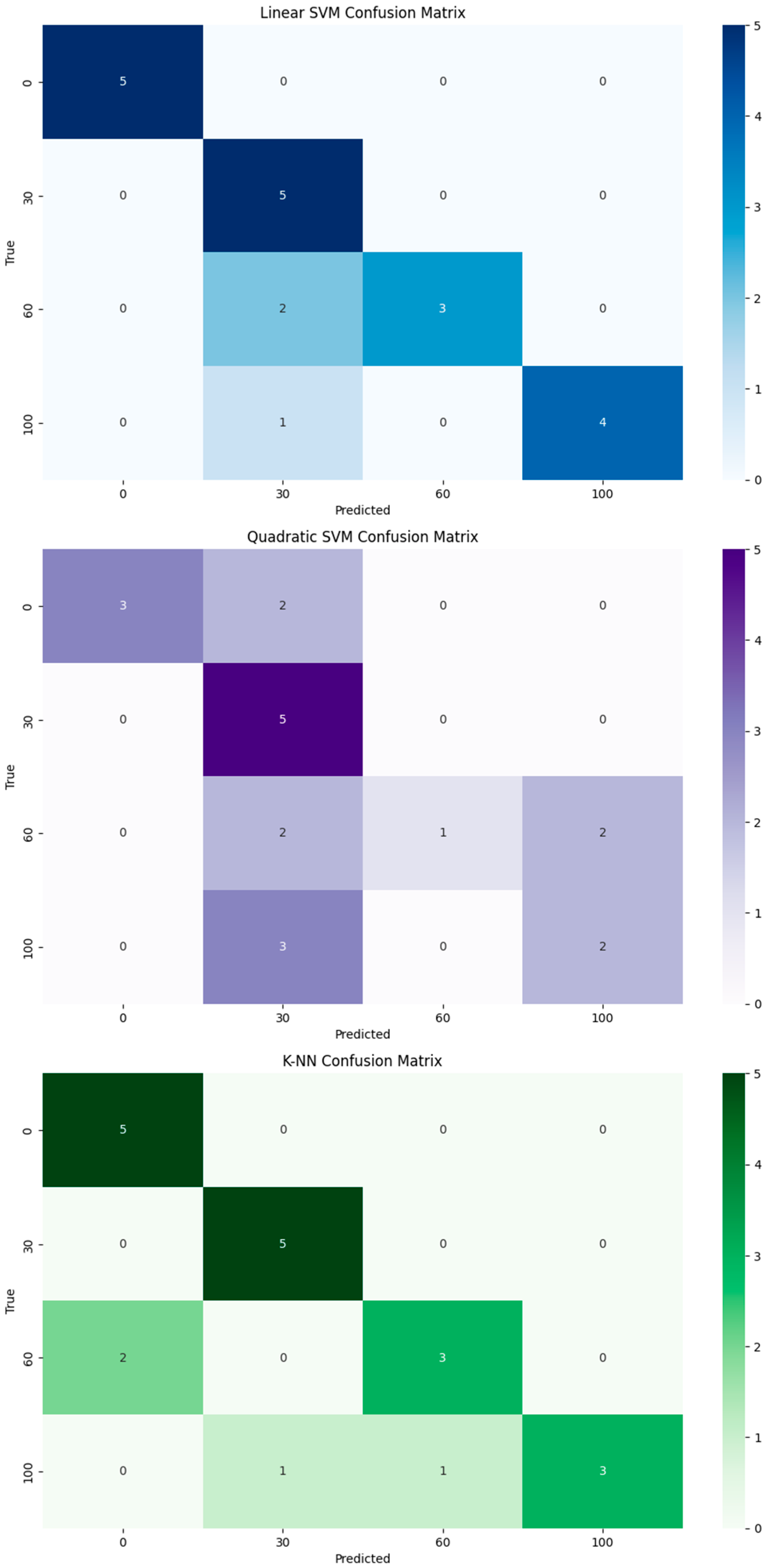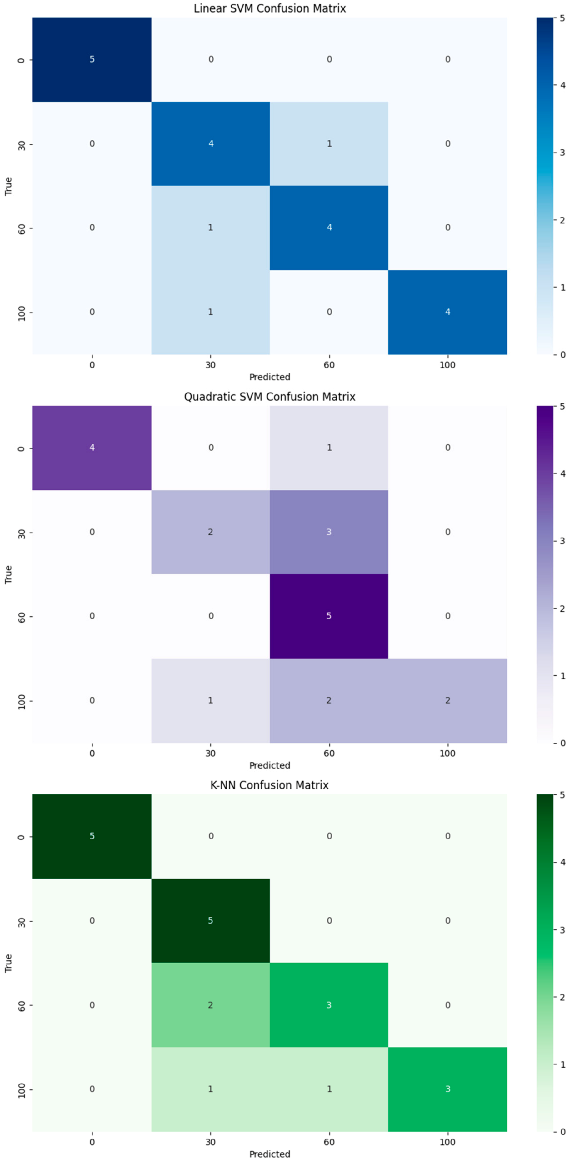 Figure 5) again showed the best results, with an average F1 score of 0.85, which is comparable to the Onyx material. Here, too, the unexposed material (0 min) was classified flawlessly, confirming its significant distinguishability from thermally stressed states. Quadratic SVM fails more significantly in this case (55% accuracy), especially in the 60 min class, where the F1 score is only 0.33, indicating unstable nonlinear separation. The K-NN model achieved an accuracy of 80%, distinguishing very well between lower temperature loads, but at 60 and 100 min there was an increased rate of confusion between classes.