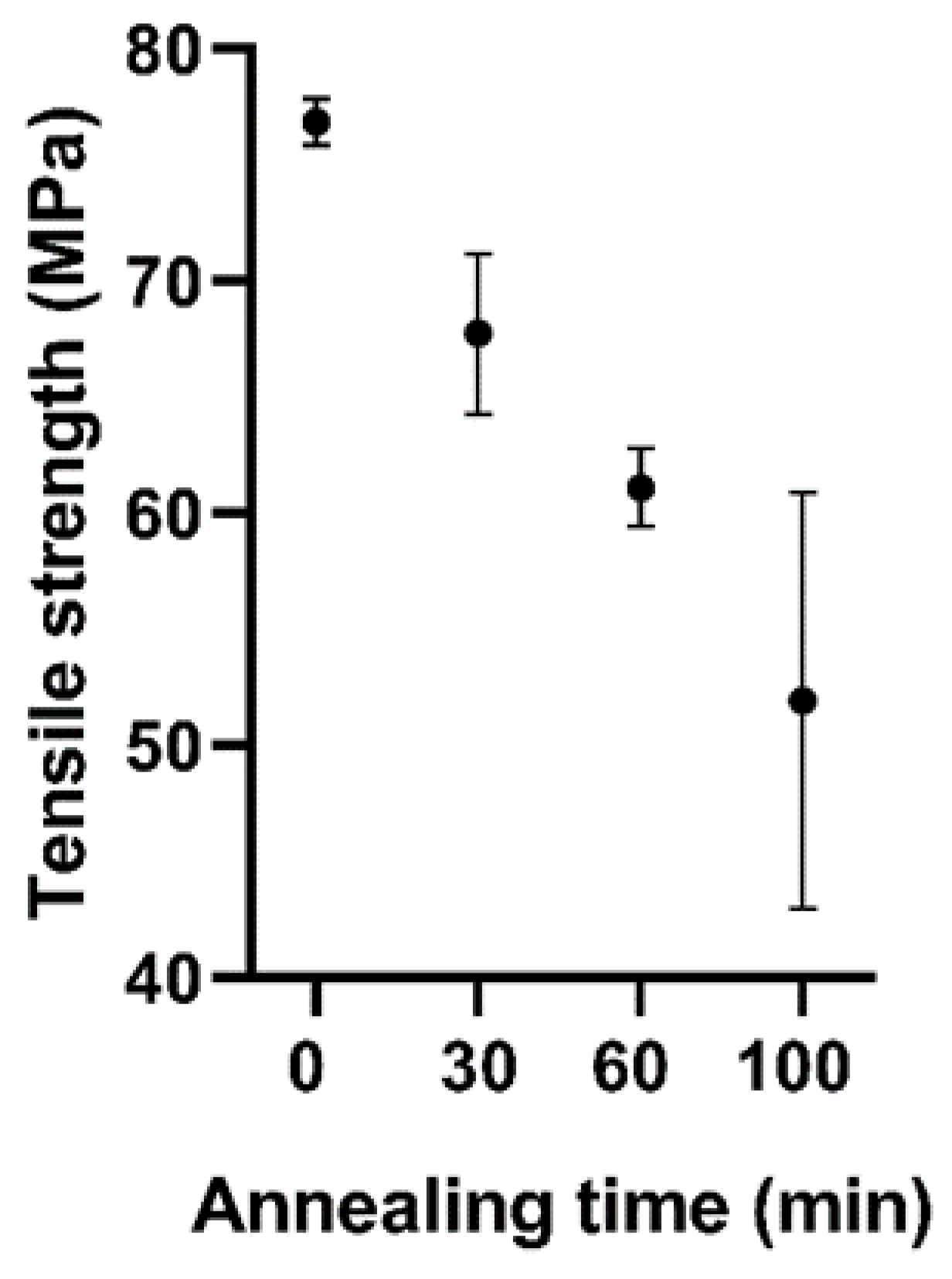 No significant differences were found among the annealed groups (30, 60, and 100 min), indicating that the main improvement in mechanical performance occurred within the first 30 min of annealing (