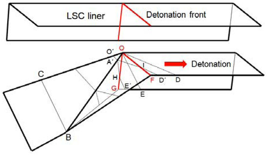 Upon detonation of the core charges in LSCs, the flat liner interacts with the detonation gas in a side direction creating a simultaneous movement of the entire liner at a given station along the length, maintaining the α = β condition. This is different than that of progressive liner collapse starting from top to bottom of the liner occurred in CSCs (Figure 1, Top).