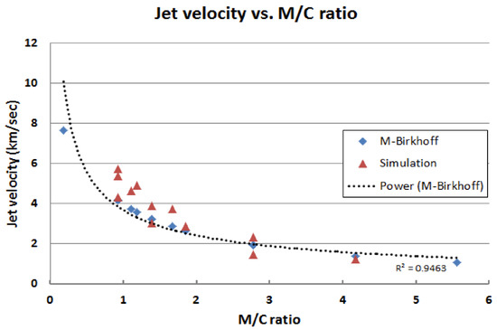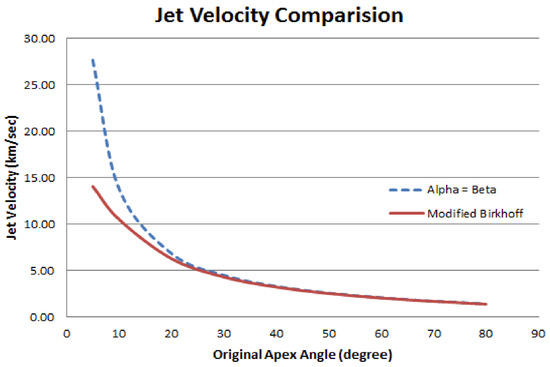 The jet velocity difference between the modified Birkhoff and numerical simulation results are quite similar in the range of higher original apex angles. The differences range from 0.07 up to 0.98 km/s with the lower original apex angle exhibiting the most difference in jet velocity, and high accuracy for higher original apex angles. The reason for this difference in the range of lower original apex angle is not clearly known at this point, but it probably represents the fundamental problem of steady-state assumption that we made in the derivation. The nonlinearity of the numerical simulation produces faster jetting at smaller apex angles which cannot be described by the steady-state equation. This falls into the same regime with the comparison in Figure 7.