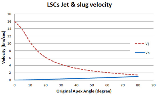 The original apex angle of LSCs is another important factor that controls the jet and slug velocities. According to the Birkhoff theory, a large apex angle creates slower jet velocity but slightly faster slug velocity, and the same tendency can be applied to the modified Birkhoff theory as well. Results comparing dependencies of the jet and slug velocities on the original apex angles follow (Table 3).