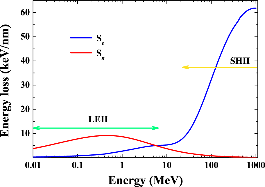 As an ion passes through a solid, energy is transferred to the host lattice via interactions with target nuclei (nuclear energy loss (Sn)) and target electrons (electronic energy loss (Se)). The Sn and Se components of the stopping power of Au ions in Co as a function of ion energy are shown Figure 1. The energy dependence of the two contributions are evident with Sn dominating in the low energy ion irradiation (LEII) region (keV to low MeV), while above ∼30 MeV in the swift heavy ion irradiation (SHII) region the energy loss is predominantly Se.