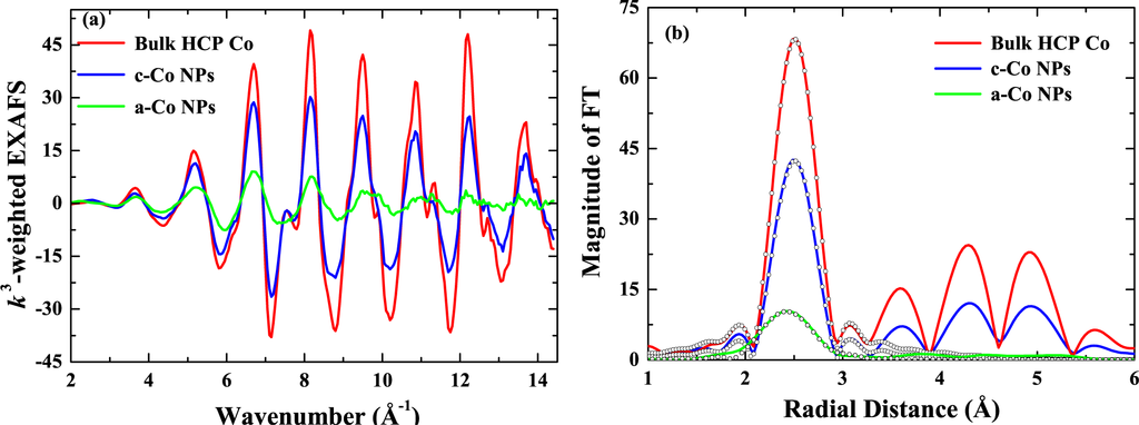 (a) k3-weighted EXAFS spectra and (b) corresponding phase corrected FT EXAFS spectra for bulk HCP Co, 3.7 nm c-Co NPs and 3.6 nm a-Co NPs (irradiated with 9 MeV Au ions to a fluence of 2 × 1013/cm2) measured at 18 K. Open circles represent fits to experimental data.