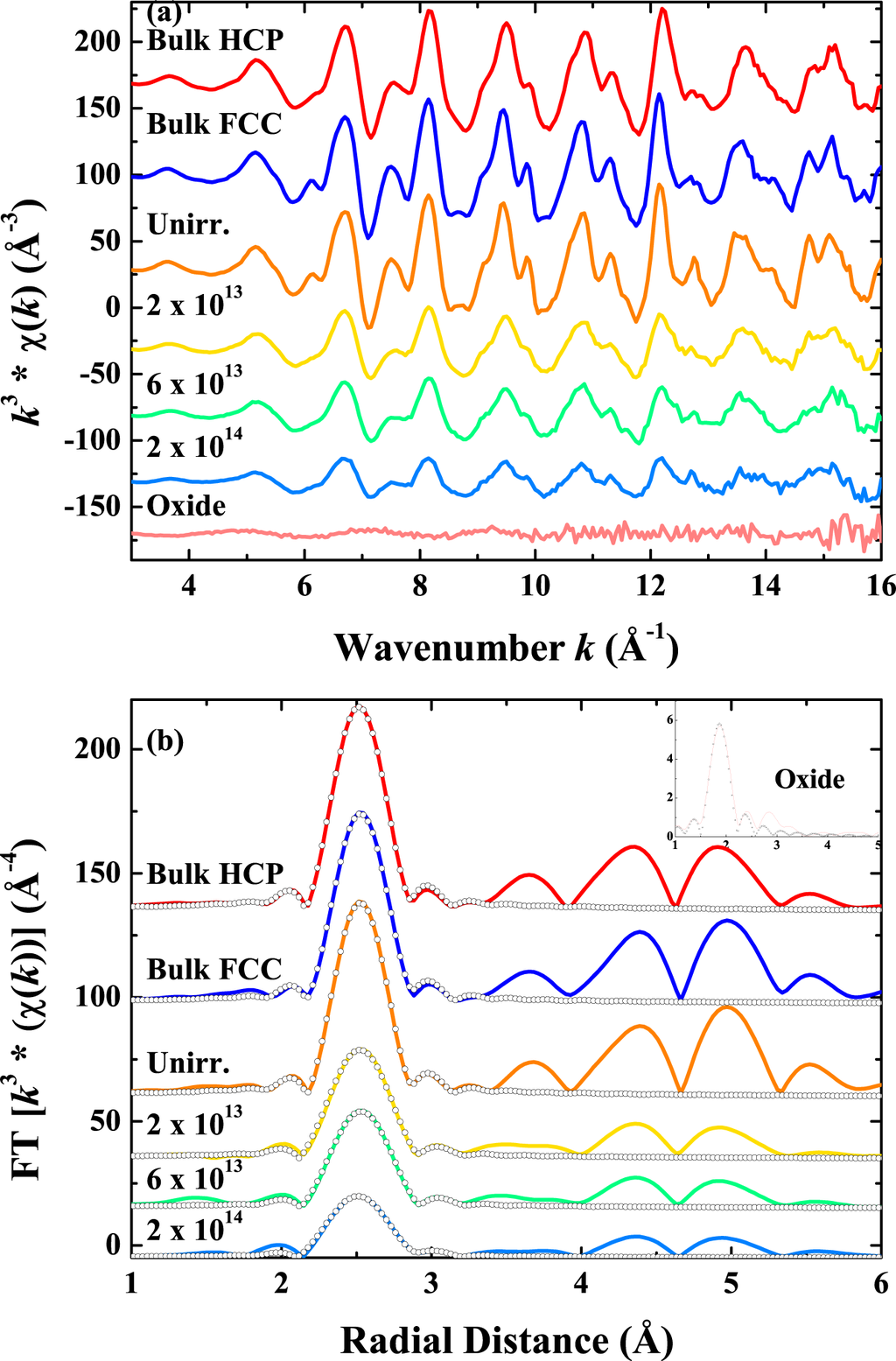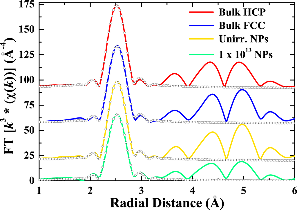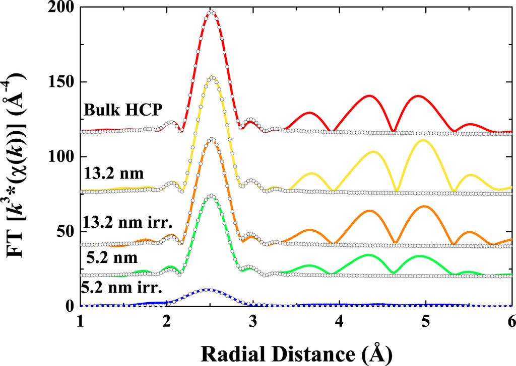 FT EXAFS spectra for bulk HCP Co, 13.2 FCC and 5.2 nm HCP Co NPs prior to and after (labeled irr.) 9 MeV Au ion irradiation to a fluence of 2 × 1013/cm2. Open circles represent fits to experimental data.
