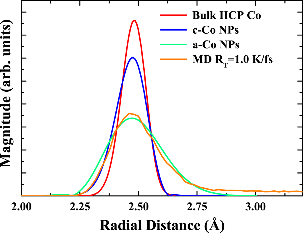 Reconstructed interatomic distance distributions for the first NN shell of bulk HCP Co, 3.7 nm c-Co NPs and 3.6 nm a-Co NPs compared to the interatomic distance distribution for amorphous Co from MD simulations.