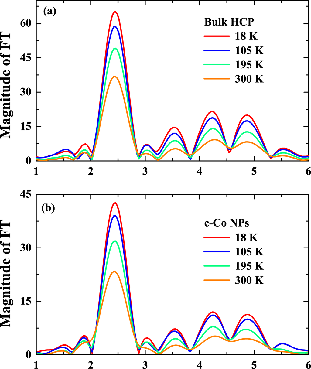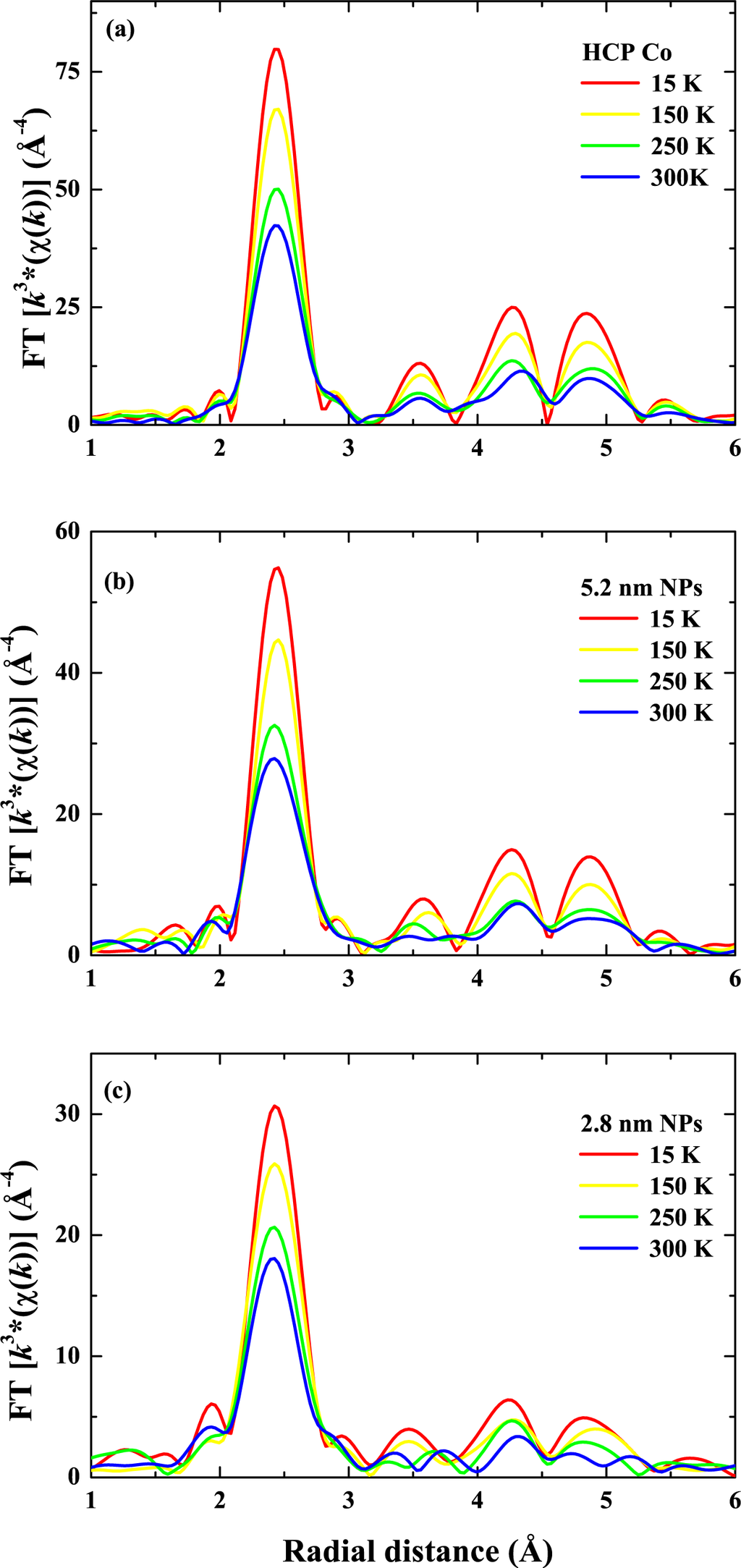 Temperature-dependent, phase-corrected FT EXAFS spectra are presented in Figure 5 for bulk HCP Co and both 5.2 nm and 2.8 nm diameter HCP Co NPs. The amplitude of the signal decreases with an increase in measurement temperature due to the increase in thermal disorder, while, as mentioned above, the amplitude for bulk material exceeds that for NPs at any given temperature due to the reduced CN and enhanced structural disorder associated with NPs.