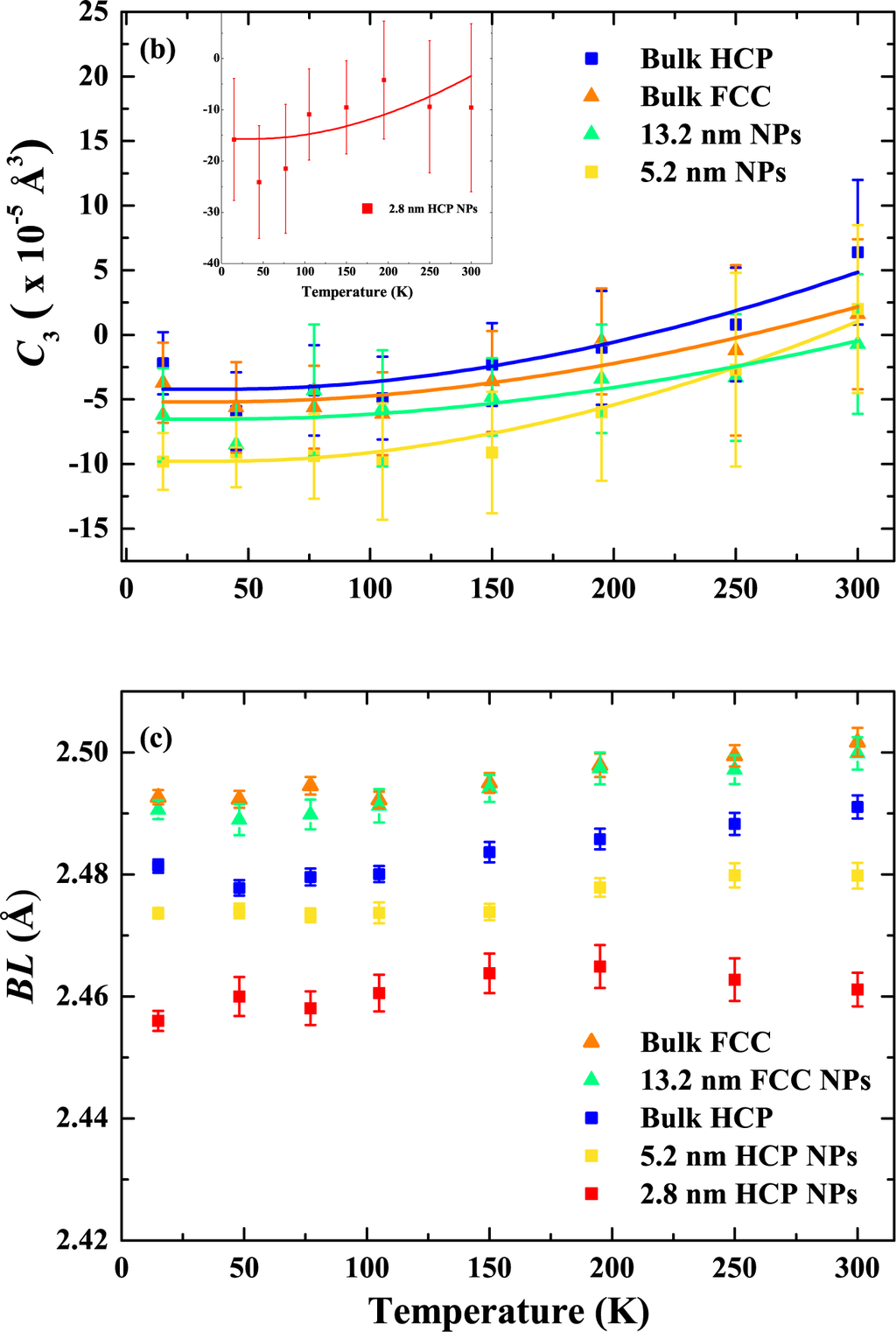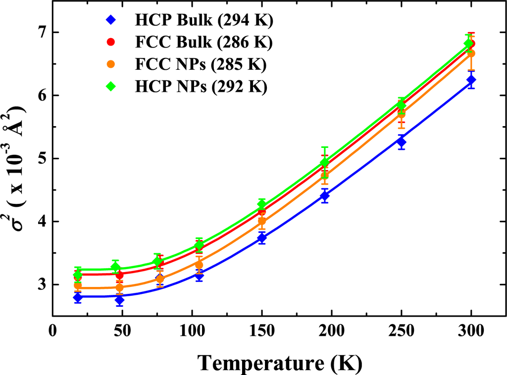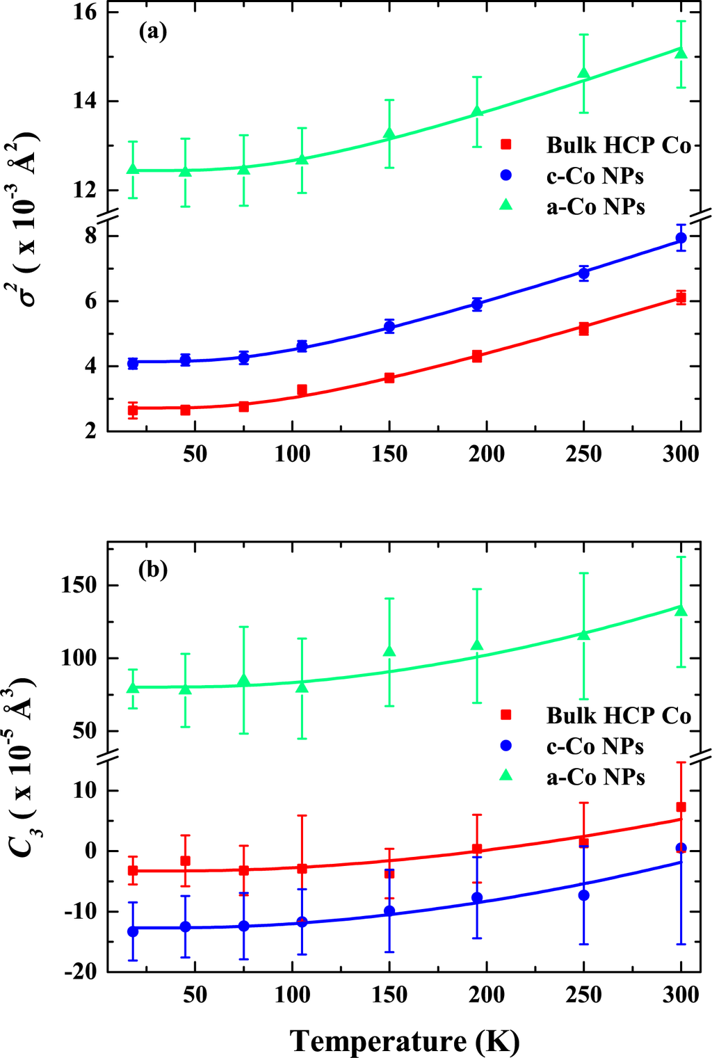 Figure 16(a) shows the temperature dependence of the σ2, obtained from individual fits of the first NN shell for all samples. Values for both the c- and a-Co NPs are offset from those of bulk HCP Co due to greater static disorder