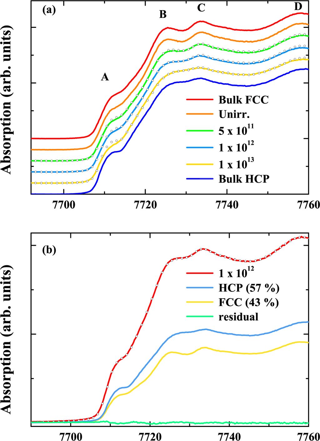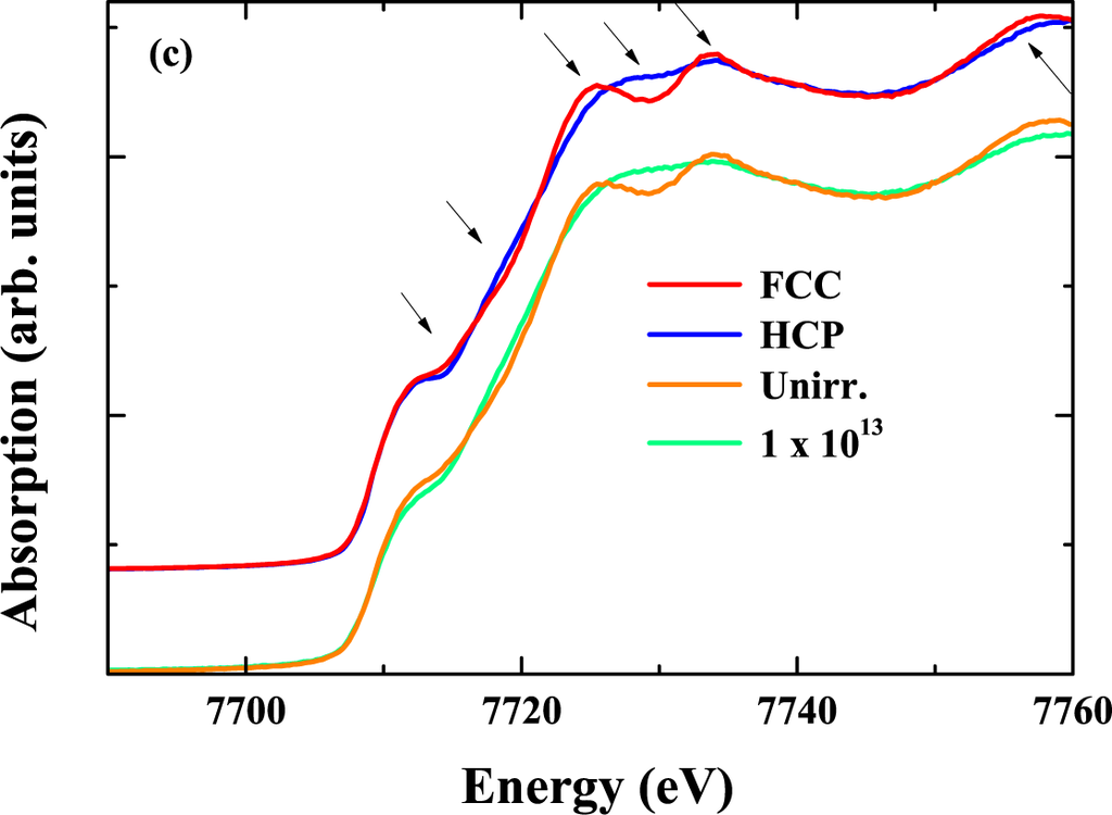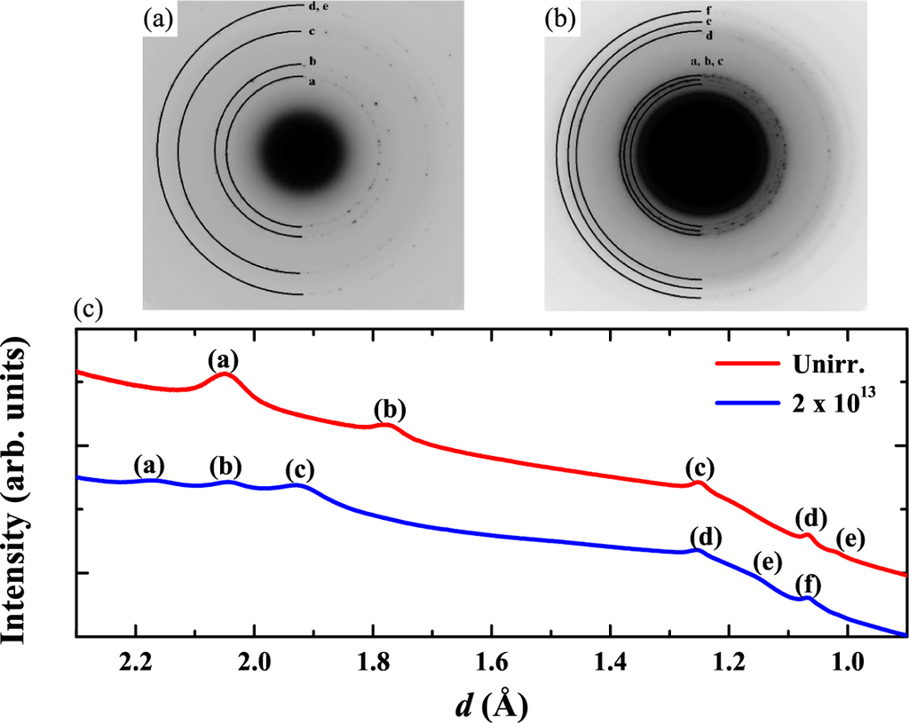 The NP size is effectively unchanged from the unirradiated state (3.7 nm). The ED patterns collected for the c-NPs and a-NPs were radially averaged and the resulting intensity profiles are shown in Figure 7(c). Indexing the ED patterns (peaks labeled A–E) yields the results listed in Table 4 and shows that the unirradiated c-Co NPs are comprised of a mixture of HCP and FCC phases. The well-defined peaks typical of randomly-oriented crystalline NPs vanish upon irradiation, consistent with (though not necessarily indicative of) the formation of an amorphous phase.