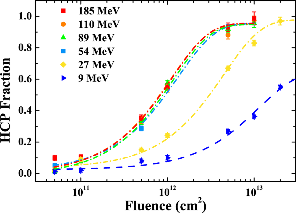 As anticipated, Au ion irradiation of bulk HCP and FCC Co standards yielded no change in the structural parameters of these crystalline metals, consistent with the general inability to form an irradiation-induced amorphous phase in an elemental metal. Finite-size effects in the form of inherent structural disorder clearly play a significant role in enhancing the sensitivity of embedded NPs to ion irradiation. Though the surrounding matrix may aid in stabilizing the amorphous NP structure, measurements with large c-Co NPs discussed above demonstrate that the presence of the matrix alone does not yield amorphous NPs for the given irradiation fluence.