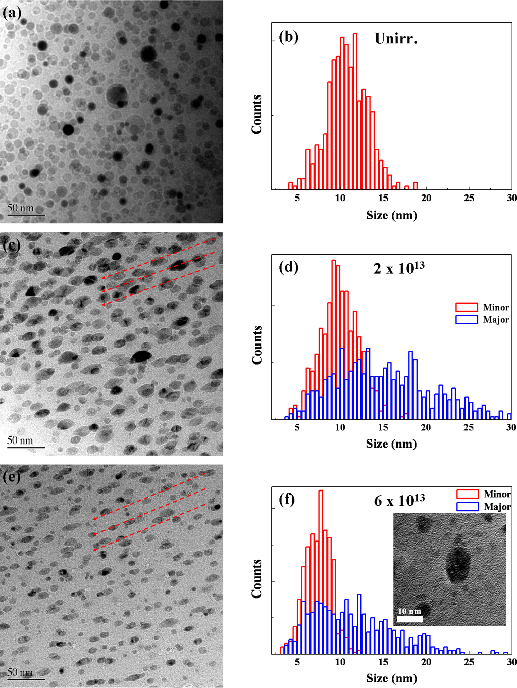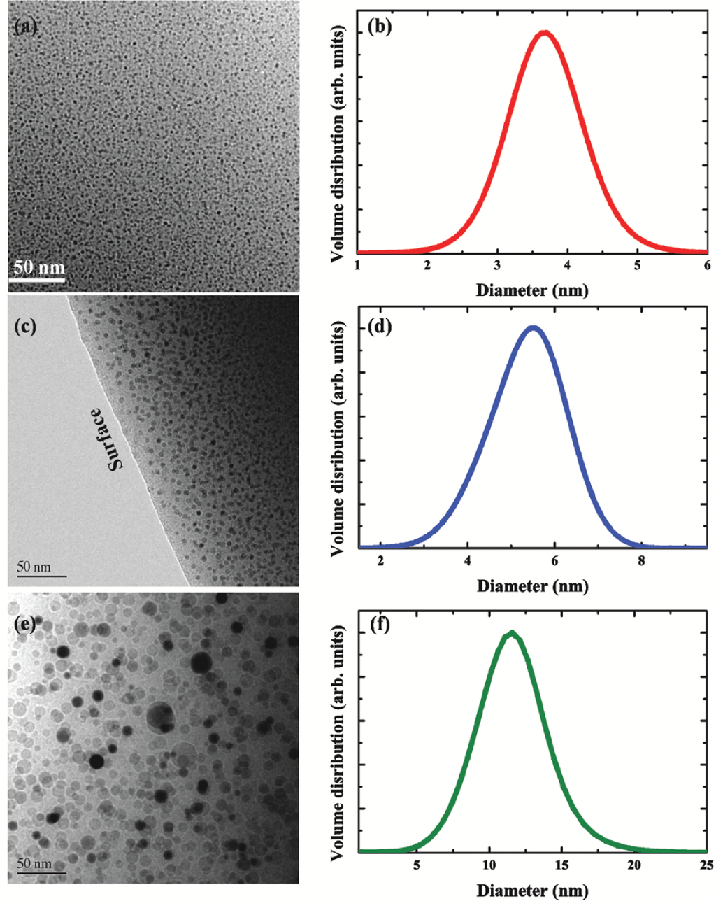 Bright field XTEM micrographs (a), (c), (e) and corresponding size distributions (b), (d), (f) determined from SAXS. The NPs were formed by implanting (a) 3.0 at.% Co and annealing at 800 °C for 1 h; (c) implanting 4.5 at.% Co at 400 °C; and (e) 3.0 at.% Co and annealing at 1,100 °C for 1 h.