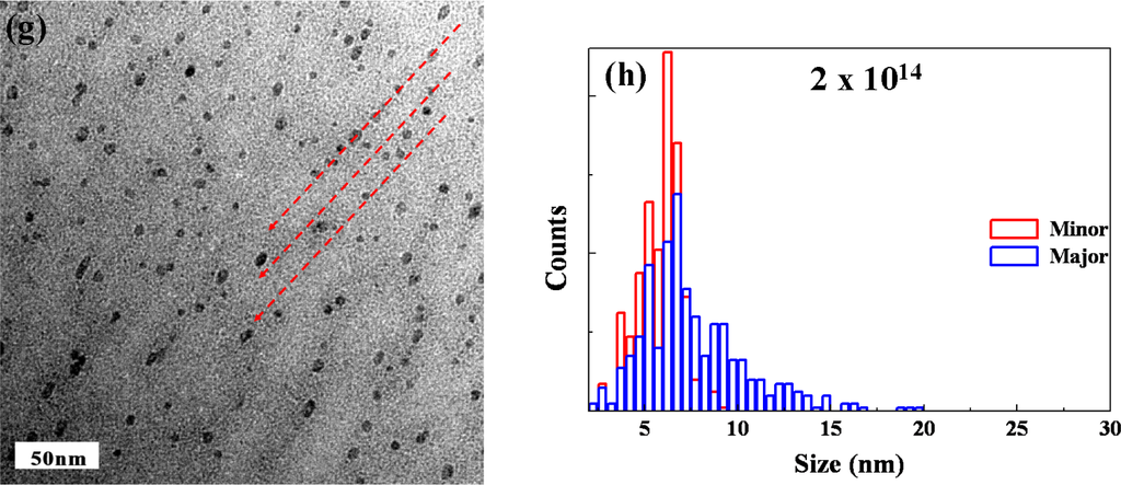 - Kluth, P.; Johannessen, B.; Foran, G.J.; Cookson, D.J.; Kluth, S.M.; Ridgway, M.C. Disorder and cluster formation during ion irradiation of Au nanoparticles in SiO2. Phys. Rev. B. 2006, 74, 014202. [Google Scholar]