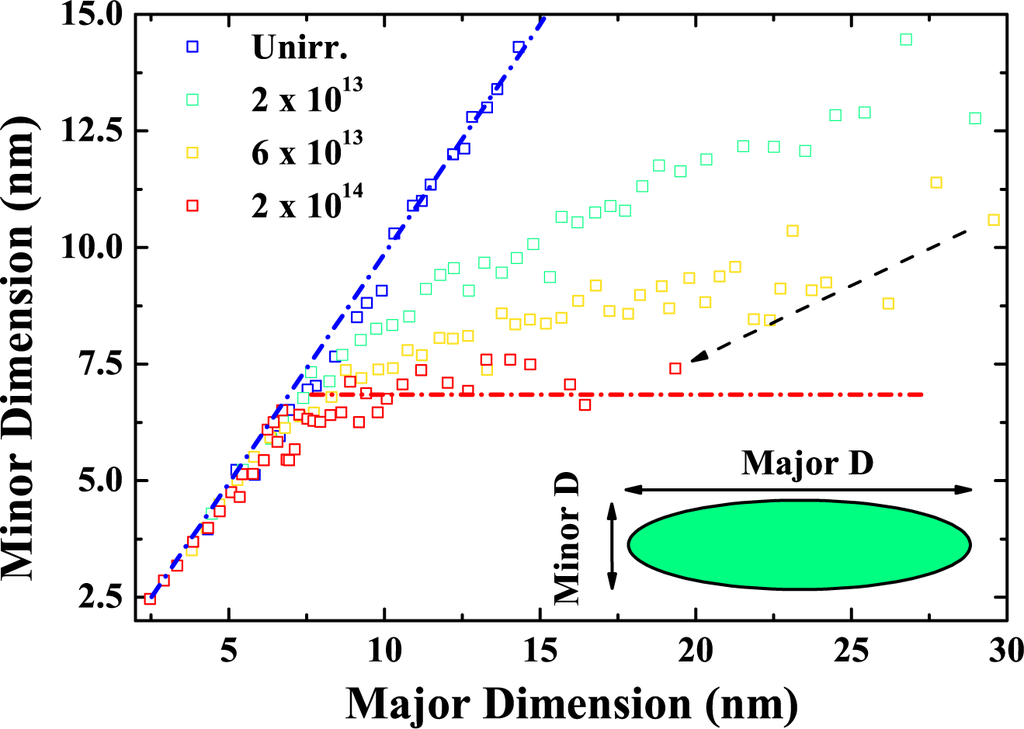 The NP shape and size were quantified with XTEM and SAXS, respectively. XTEM samples were prepared entirely at or below room temperature to stem thermal effects. Electron transparency was achieved with conventional mechanical thinning, polishing, and dimpling followed by ion milling at liquid-N2 temperature with 3.5 keV Ar ions at an incident angle of 4°. XTEM bright-field images and electron diffraction (ED) patterns were acquired using a Phillips CM300 microscope operating at 300 kV.