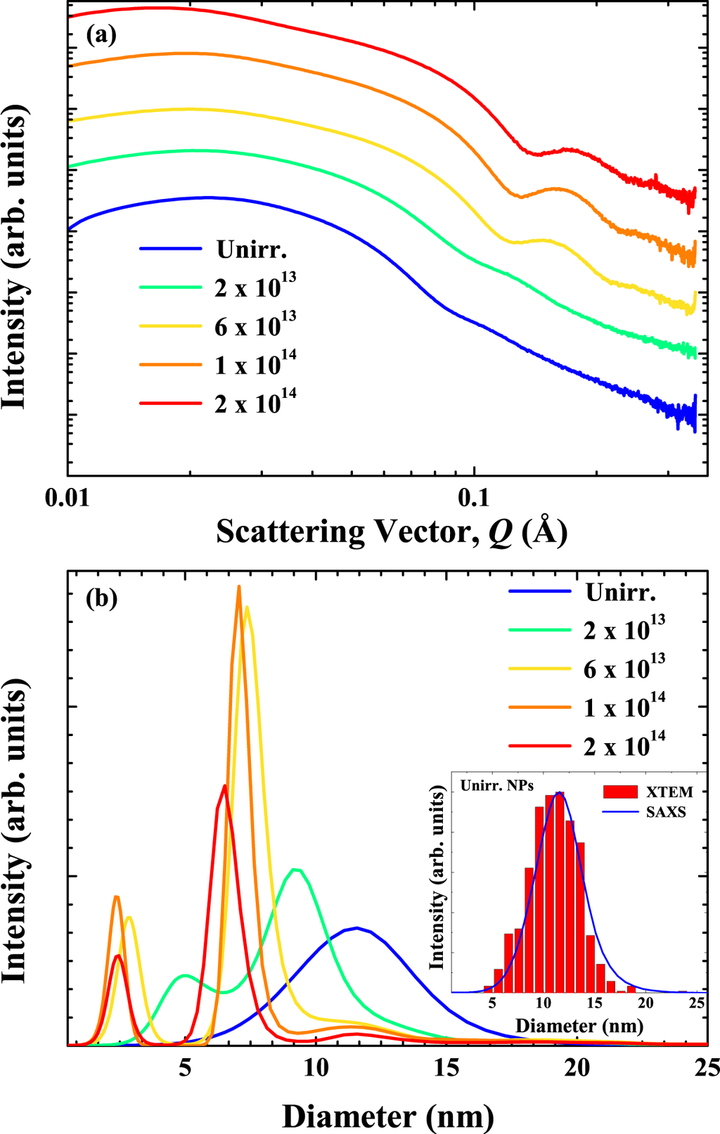 Transmission SAXS measurements were performed at beamline 15ID-D of the Advanced Photon Source, Argonne, IL, using 11.27 keV X-rays (1.1 Å wavelength). The scattering intensity I(Q) was collected for 5 s at a camera length of 1,871 mm. A scattering spectrum from an unimplanted SiO2 layer was subtracted from all NP spectra. The maximum entropy method (MEM) [39,40] was used to determine the NP size distribution.