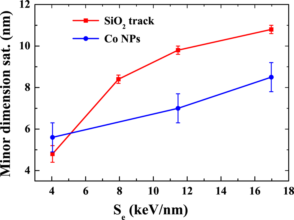 For this study, three samples with mean NP sizes of 3.7, 5.2 and 13.7 nm (the same samples shown in Figure 2) were investigated. Samples were then irradiated at room temperature with 9 MeV 197Au ions to a fluence of 2 × 1013/cm2. With reference to Figure 1, Se and Sn are comparable. The energy loss in Co is greater than in SiO2 given the greater atomic number of the former (see Table 1).