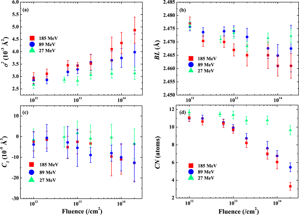 For the measurement-temperature-dependent EXAFS analysis, the evolution of the first NN structural parameters was determined by analysing each data set over the 15–300 K temperature range individually with the CN and E0 fixed to the values determined from the lowest-temperature data (15 K). The BL, C3 and σ2 were allowed to vary freely and the temperature dependence of σ2 and C3 were fit with a correlated Einstein model (Equations (1) and (2)) to determine the static and temperature dependent contributions to the total σ2 and C3.