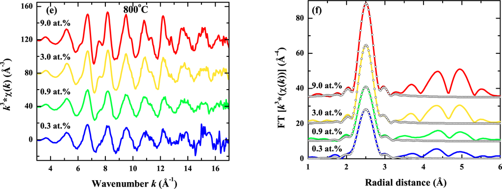 (a), (c), and (e) k3-weighted EXAFS spectra (offset for comparison) and corresponding phase-corrected FT spectra (b), (d), and (f) for bulk standards, 1,100 °C, and 800 °C samples measured at 18 K. Open circles (b), (d) and (f) represent fits to experimental data.