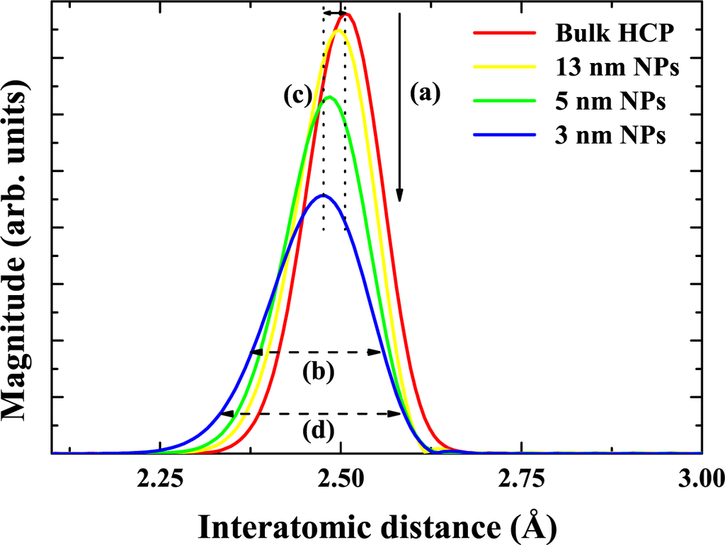 The reconstructed interatomic distance distribution for selected samples is shown in Figure 4 following Reference [42] and using a photoelectron mean free path of 8 Å, the latter following from [43]. This figure better demonstrates finite-size effects. The observed structural changes with decreasing NP size relative to the bulk standard are as follows: (a) the decrease in peak height (or lower coordination) stems from the under-coordinated surface atoms; (b) the increasing FWHM (or increasing disorder) results from the relaxation and reconstruction of the under-coordinated surface atoms; (c) surface-curvature-induced capillary pressure yields a BL contraction; and finally (d) the asymmetric bondlength distribution (or negative C3) results from the superposition of the different BLs from the core and surface/interface (where the latter are shorter). For semiconductor NPs embedded in SiO2, simulations [44] and experiments [45] have demonstrated that the interfacial atom environment is highly distorted to accommodate material and bonding differences across the interface. Similar trends have been reported for other embedded elemental metal NPs [46–49].