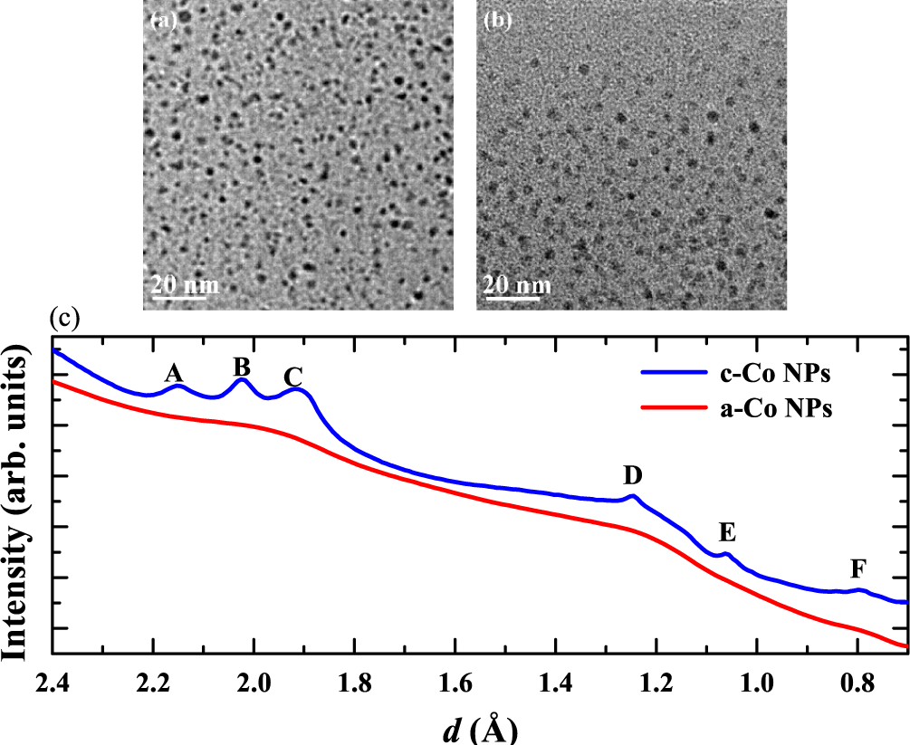 XTEM micrographs for (a) 3.7 nm c-Co NPs and (b) 3.6 nm a-Co NPs and (c) shows the radially integrated ED patterns for both samples.