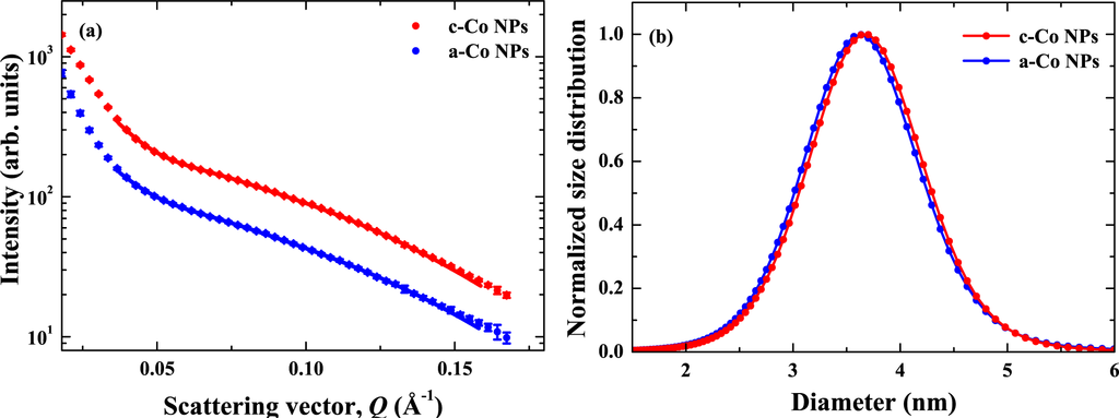 (a) Background-subtracted SAXS intensities for c-Co NPs and a-Co NPs (solid lines represent fitted regions) with spectra offset for comparison and (b) normalized NP size distributions.