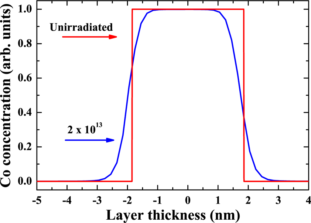 Figure 8(a) shows background-corrected SAXS spectra for the c- and a-Co NPs with the fitted Q range overlaid as a solid line while Figure 8(b) demonstrates that the normalized size distributions are clearly Gaussian in shape. The average NP diameter before and after irradiation was 3.7 ± 1.0 nm and 3.6 ± 1.0 nm, respectively, and thus irradiation did not produce a change in NP size. These results agree well with the TRIDYN [62] simulations of Figure 9 for irradiation-induced atomic inter-mixing of a Co layer (3.7 nm in thickness) embedded in SiO2 and irradiated with Au ions to a fluence of 2 × 1013/cm2 at an energy of 5.3 MeV. The Au ion energy for the TRIDYN simulation was that of the Au ions in SiO2 at the peak Co concentration (1 μm) in the NP sample. Recoiled Co, Si and O atoms slightly alter the Co atomic depth distribution leading to a less well defined Co/SiO2 interface after irradiation. Inter-mixing of the matrix constituents and Co layer is clearly minimal and well below that required to stabilize the amorphous phase in bulk Co through the addition of Si and O atoms [63]. As such, it is argued that the irradiation-induced structural changes described below do not result from the presence of recoiled matrix constituents. As above, the nuclear and electronic energy losses are comparable. To identify if one or both energy loss regimes is/are responsible for the observed amorphisation would necessitate experiments as a function of Au ion energy.
