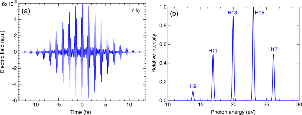 (a) Pulse shape and (b) intensity spectrum of a 7 fs high-harmonic pulse (attosecond pulse train) composed of multiple harmonic orders used in the present study (see text).