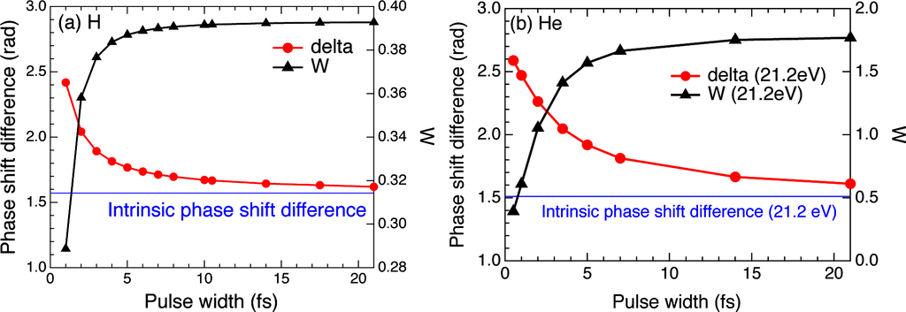 Pulse-width dependence of the TDSE-derived apparent phase shift difference (relative phase) δ (left axis) and W = |cs/cd| (right axis). (a) The target atom is hydrogen, and ħω = 10.2 eV. The thin horizontal line denotes the value (= π/2)) of the Coulomb phase-shift difference; (b) The target atom is helium, and ħω = 21.2 eV. The thin horizontal line denotes the value (1.511 [63]) of the intrinsic scattering phase-shift difference δsc for ħω = 21.2 eV.
