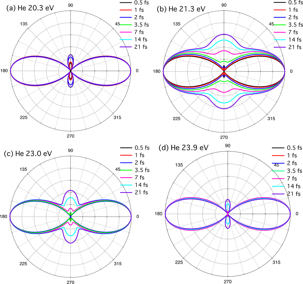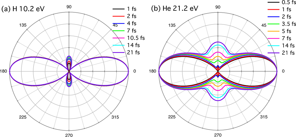 The pulse-width dependence of δ and W for ħω = 21.2 eV close to the 1s2p resonance (21.218 eV) is shown in Figure 2(b). The calculations have been done at different values of pulse width T1/2 between 500 as and 21 fs. As expected from the discussions in Sections 2.1 and 2.2, and similarly to the case of a hydrogen atom (Subsection 2.3), both δ and W substantially change with pulse width, especially when the pulse is shorter than 10 fs. Accordingly, the PAD also varies as shown in Figure 3(b). One finds that the distribution to the direction perpendicular to the laser polarization again decreases as the pulse is shortened. As stated earlier, strictly speaking, Equation (4) is applicable only to ωf = ωi + 2ω, and the actual PAD involves integration over ωf. Nevertheless, the results in Figure 2(b) can well be described by Equation (4) [44], except for δ in the ultrashort pulse regime T1/2 ≲ 1 fs, where the spectrum becomes broader than the level spacing. If we compare Figure 2(a) for H and (b) for He, both for the 2p resonance, the phase-shift difference δ has a similar pulse-width dependence. As for the amplitude ratio W = |cs/cd|, it is smaller than unity, i.e., |cd| > |cs| regardless of pulse width for H, while its variation is larger for He; |cd| > |cs| in the short-pulse limit, and |cd| < |cs| in the long-pulse limit. Accordingly, the variation in PAD is more prominent for He than for H (Figure 3).