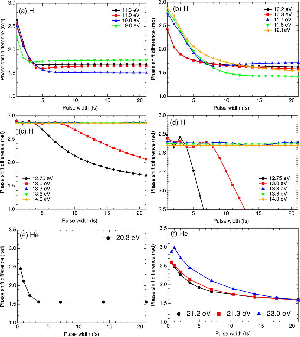 Pulse-width dependence of the phase-shift difference δ for H [(a)–(d)] and He [(d)–(g)] for different values of photon energy. Panel (d) is the close-up of the vertical-axis range between 2.5 and 3.0 radians of panel (c). The pulse is nonresonant for (a) and (e), resonant with a single level for (b) and (f), and resonant with multiple levels for (c), (d), and (g). The resonant excitation energies for He 1s2p1P, 1s3p1P, 1s4p1P, 1s5p1P levels are 21.218, 23.087, 23.742, and 24.046 eV [48].