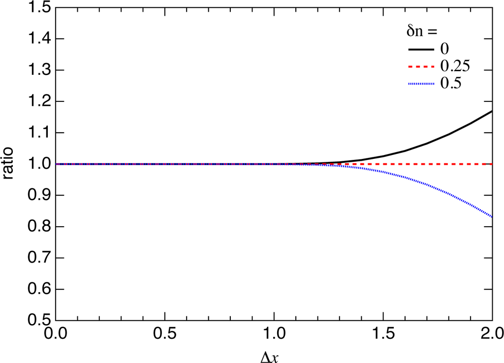of the values at discrete points, where xn = (n + δn)∆x, with ∆x(> 0) and δn being the increment of x and the offset of n, respectively. In Figure 5 we plot the ratio,