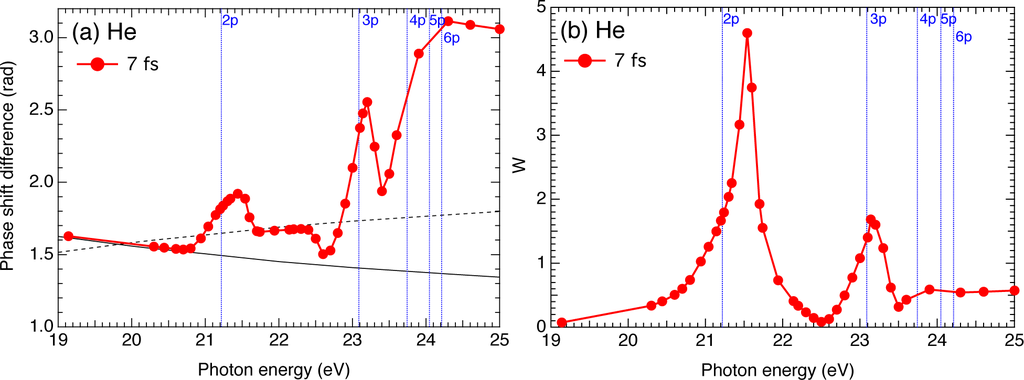 Figure 7 shows the photon energy dependence of the phase difference δ and the amplitude ratio W for a pulse width of 7 fs. Although the number of data points is limited, we can see features basically similar to those in Figure 1 for H.