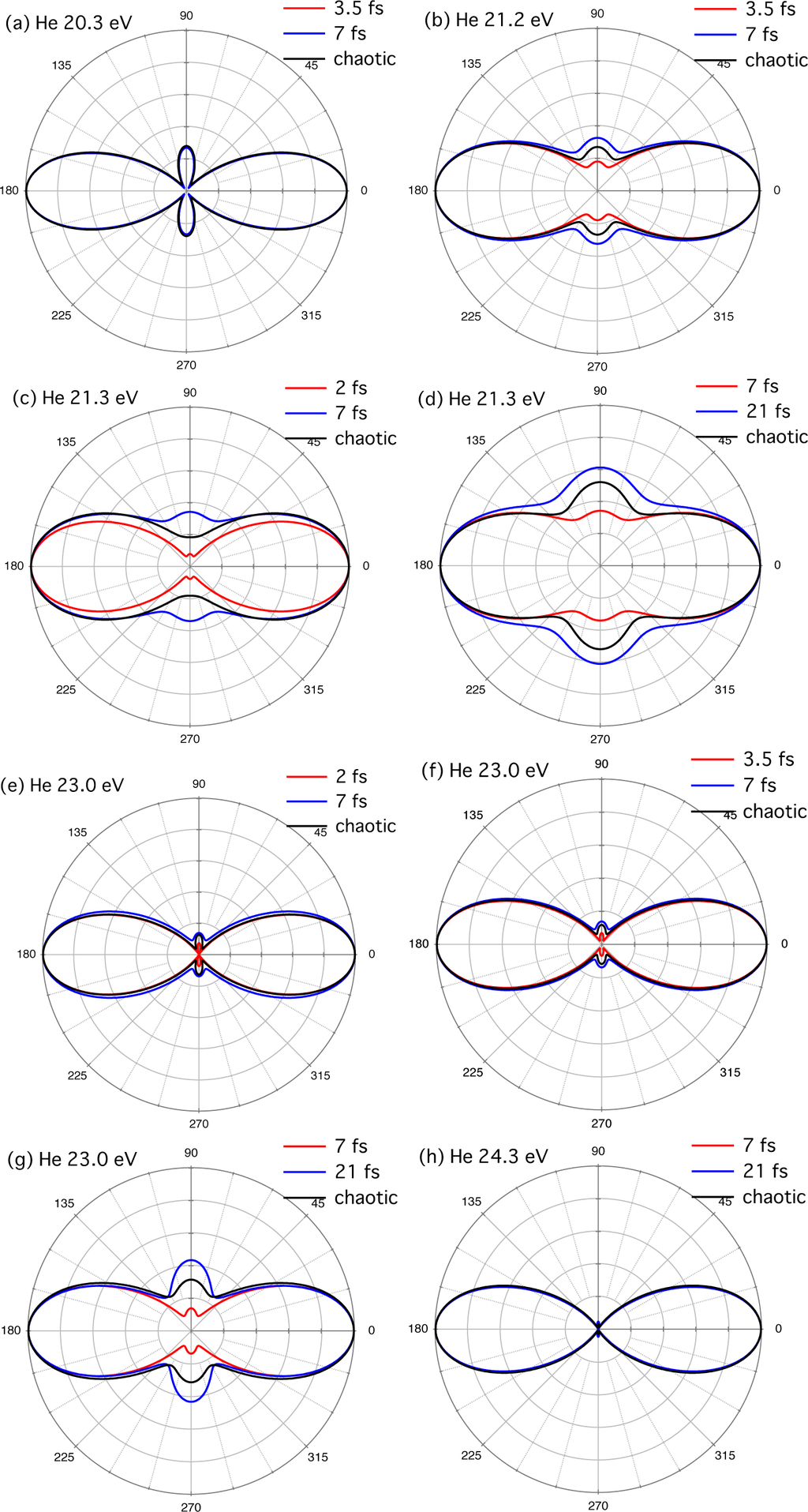 Photoelectron angular distribution by a chaotic pulse for a photon energy, coherence time (CT), and mean pulse width (MPW) indicated in each panel. The target atom is helium. The red and blue curves are for Gaussian pulses whose widths are given by the CT and MPW, respectively of the chaotic pulse. For example, in panel (b), the photon energy, CT, and MPW, are 21.2 eV, 3.5 fs, and 7 fs, respectively.