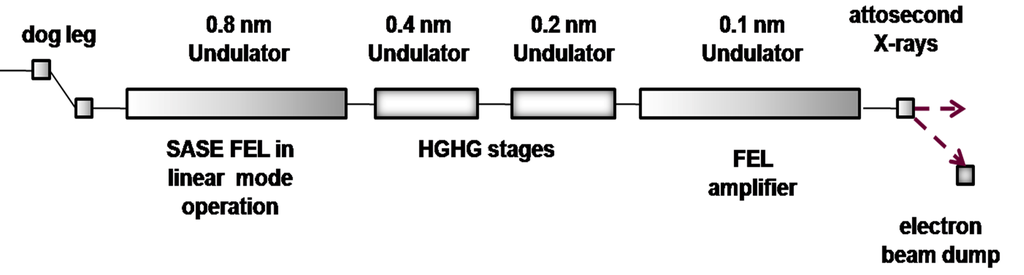 Among these schemes, echo-enabled harmonic generation (EEHG) shows a great promise for producing a fully coherent short wavelength FEL. A classic high gain harmonic generation (HGHG) scheme [] has suffered from the low up-frequency conversion efficiency. Consequently, this led naturally to a multistage approach for X-ray production seeded at an ultraviolet wavelength []. The beam echo effect has remarkable frequency up-conversion efficiency and allows for the generation of high harmonics with a relatively small energy modulation []. Using an EEHG scheme, coherent soft X-rays at 5 nm with GW peak power was calculated, starting from a 240 nm seeding laser []. Later, the EEHG scheme with an additional electron bunch compression has been proposed []. The calculation showed that X-ray pulses at 1 nm with a peak power of a few hundred megawatts and a pulse duration of 20 attoseconds full width at half maximum (FWHM) is expected. For the radiation at an even shorter wavelength, a four-stage HGHG-FEL scheme has been proposed, for which a train of attosecond pulses at 0.1 nm wavelength was expected in simulation []. This concept was realized by the generation of the eighth harmonic of SASE radiation using a single electron bunch and a four-stage HGHG configuration, as shown in Figure 1. The electron bunch passes through a sequence of four relatively short undulators.