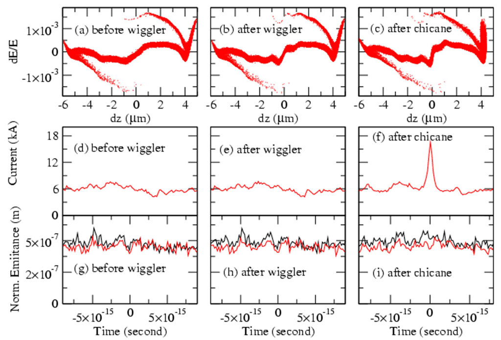 Figure 8 shows the simulation results for a ~20 μm (average current 3 kA)-long electron bunch. Figure 8a–c shows the longitudinal energy distribution before wiggler, after wiggler and after chicane, respectively. In Figure 8a, the electron bunch has a slight uphill in the central part of the electron bunch. The interaction of the electron bunch with the co-propagating laser (7.5 fs FWHM, 800 nm) duplicates the laser field oscillation in the energy distribution of the electron bunch, as shown in Figure 8b. In Figure 8c, the electron bunch is further compressed by the chicane, so that its profile becomes steeper. The energy spread is (ΔE/E) always less than the FEL parameter (ρ = 5.4 × 10−4). Figure 8d–f shows the current profile; before wiggler, after wiggler and after chicane, respectively. The current profiles before wiggler and after wiggler are similar in shape and magnitude. As seen in Figure 8f, after chicane, the current profile contains two major current peaks of 5.6 kA and 5 kA in the central part, due to the density modulation in the chicane. This current enhancement in the central part of electron bunch is caused by the steepening of the ΔE/E profile in the energy spread of electrons (Figure 8c). Figure 8g–i shows normalized emittances (both longitudinal and transverse) of the electron bunches. No significant change is observed in emittance due to these interactions.