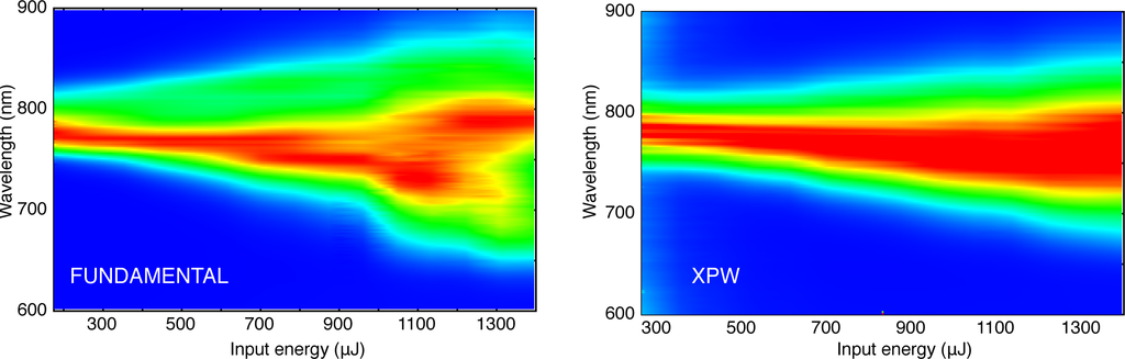 Moreover, extensive spectral broadening is measured. The calculated FWHM spectral bandwidth is increased by a factor of 2.4. The expected temporal shortening (the ratio of input laser pulse duration over output XPW pulse duration using Fourier-transform limited values) is around 3. The discrepancy comes from the differing spectral intensity profiles. The output spectrum supports sub-10 fs duration (8.6 fs Fourier transform limited). At lower efficiencies, for an unchirped pulse, spectral broadening following XPW is a direct consequence of the shortening of the pulse duration by a factor of 1.7 [23]. Here, the higher XPW efficiency is associated with important self-phase modulation (SPM) on the fundamental beam, and thus significant spectral broadening, a feature that is transferred onto the XPW wave. Simultaneous pulse shortening during the process prevents the XPW pulse from spectral and temporal distortions [30]. The higher the XPW efficiency, the more pronounced the broadening. This is illustrated in Figure 3, displaying the spectral evolution of the fundamental and XPW waves with respect to input pulse energy. While the fundamental spectrum exhibits features typical of SPM, the process provides smooth and homogeneous broadening of the XPW spectrum. These clean spectral features indicate that SPM on the XPW beam is negligible. Although significant spectral broadening and reshaping during XPW have already been observed before [27], they are particularly emphasized here. This results from the combination of high efficiency and perfect spectral phase correction thanks to the spectral phase-loop optimization of the Wizzler device (Figure 2(a)).