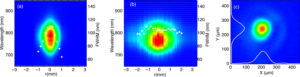 Spectro-spatial distribution of the XPW beam, 15 cm after the second crystal (a) and propagated over 2 m (b). Spectral FWHM measured across the beam profile are indicated with white diamonds; (c) Spatial intensity distribution of the XPW beam at the focus of a 500 mm lens.