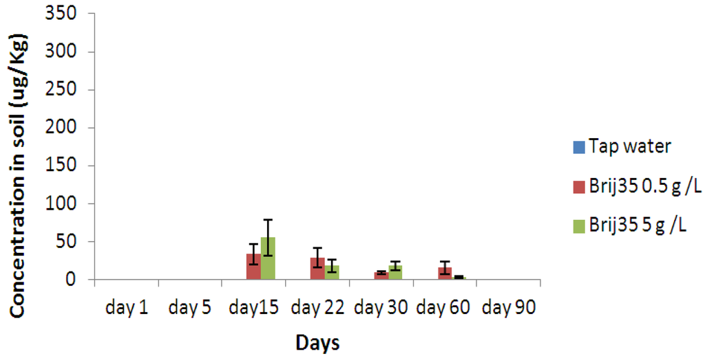 In terms of the amount of unrecovered metribuzin in soil, results showed that in the presence of surfactant, the amount of unrecovered metribuzin was less than the one in the tap water treatment indicating that the non-ionic surfactant could have influenced metribuzin degradation in soil. As indicated in (Figure 3) the presence of surfactant reduced the loss of metribuzin. This may be explained by the findings of Laha and Luthy (1992) [58] that showed a decrease in phenanthrene degradation in the presence of non-ionic surfactants above CMC compared to those below CMC. They assumed that micelles can hold the pesticide from transporting to bacterial cells resulting in an inhibition of bactaerial mineralization of the pesticide. Similarly, comparing to Brij30 and Triton X-100, Brij35 reduced the bioavailability of phenanthrene as a result of the deficient interaction between the hydrophilic moiety of Brij35 (long polyethoxy chain) and bacterial cell membrane [59]. This assumption has been confirmed by Allen et al. (1999) [60] who found that cell disruption of microbes is the main cause of inhibition of PAHs degradation, in the presence of nonionic surfactant, Triton X-100.