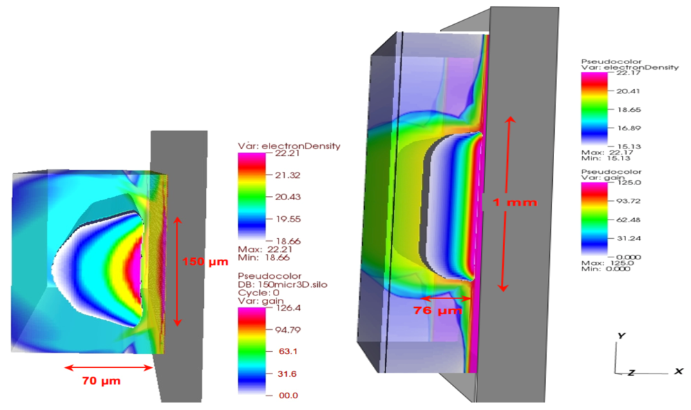 Image in false colors of plasmas created by 100 µm (left) and 1 mm (right) focal width. For 1 mm large width, the plasma flow along the target surface is very weak.