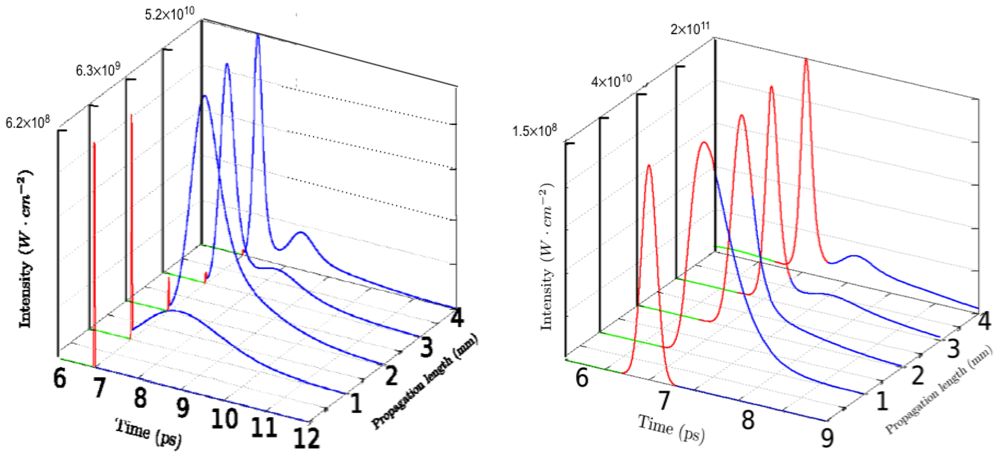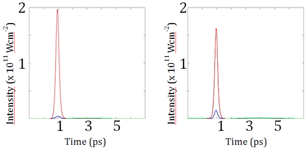 Evolution of the intensity versus time along the 30 µm (left, high harmonic generation (HHG) = 30 fs) and 100 µm width (right, HHG = 200 fs) plasma columns. The green, red and blue lines stand for the ASE, seed and wake fields. The vertical scales are not constant to account for amplification.