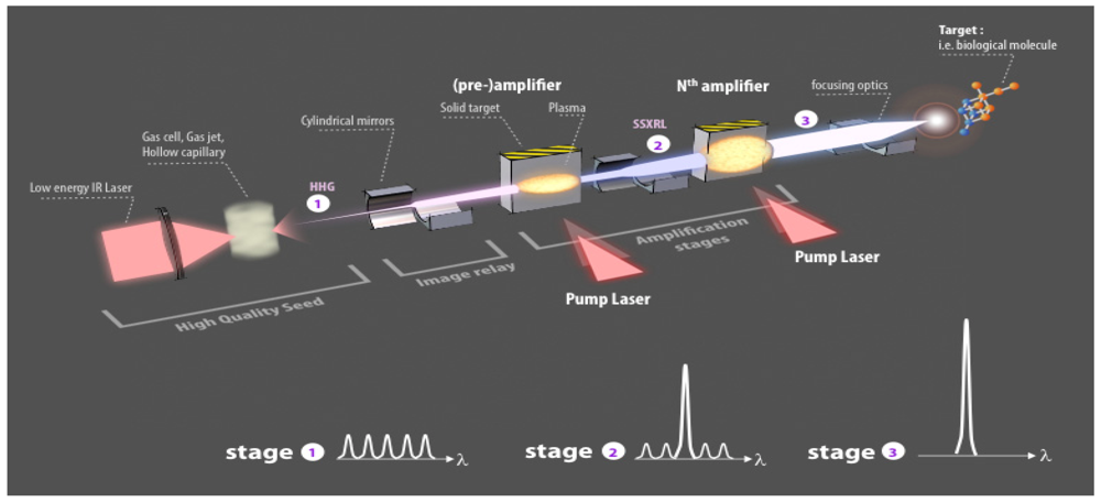 Artistic view of an amplification chain starting, from left to right, with the HHG source, focusing optics, pre and main amplifiers.