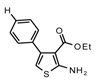 A 100 mL round bottom flask was charged with 2 mmol of acetophenone (0.330 g, 2 mmol), sulfur (0.064 g, 2 mmol), ethylcyanoacetate (0.226 g, 2 mmol) and morpholine (0.174 g, 2 mmol), and lightly swirled. The flask was left open to atmospheric conditions and placed in a 120 °C oven for one hour. The crude reaction mixture was quenched with water and extracted with methylene chloride. The organic layer was dried over anhydrous magnesium sulfate and the solvent was removed in vacuo. The resulting yellow mixture was purified by column chromatography using a 1:1 CH2Cl2-cyclohexane eluent to afford the 4-phenyl-2-aminothiophene-3-carboxylic acid ethyl ester in 43% yield.