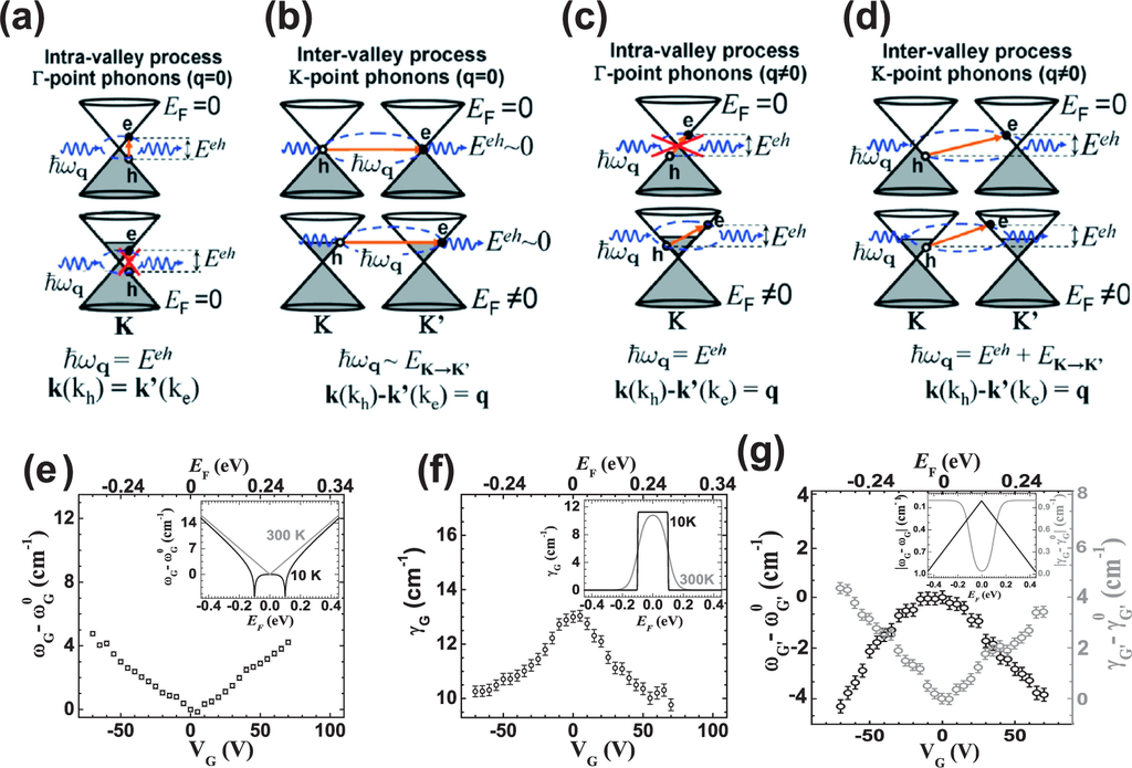 (a) Possible (EF = 0) and not possible (EF ≠ 0) AV q = 0 processes for e-h pair creation (annihilation) due to phonon (with energy ħωq) absorption (emission); (b) possible (EF = 0 and EF ≠ 0) q = 0 (measured from the K point) EV processes; (c) not possible (EF = 0) and possible (EF ≠ 0) AV processes and (d) possible EV processes for electron-hole pair creation (annihilation) due to phonon (with energy ħωq) absorption (emission) when the phonon wave-vector is not zero (q ≠ 0). Eeh is the e-h pair energy and EK→K′ is the energy required to translate an electron from K to K′; (e) The frequency ωG hardening and (f) decay width γG narrowing for the G band Raman feature as a function of gate voltage Vg. The insets in (e) and (f) are theoretical predictions of the EF dependence of
