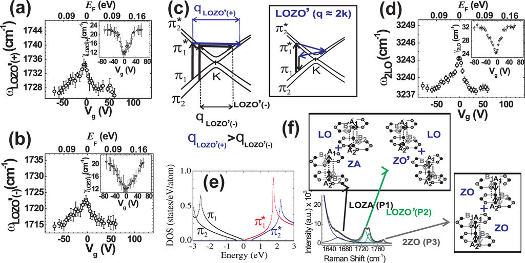and γq for an AV q = 0 process; (g) The Vg dependence of the 2iTO (q = 2k) ωG′ and γG′. The inset in (g) shows illustrative predictions for the Vg-dependence of the phonon frequency correction